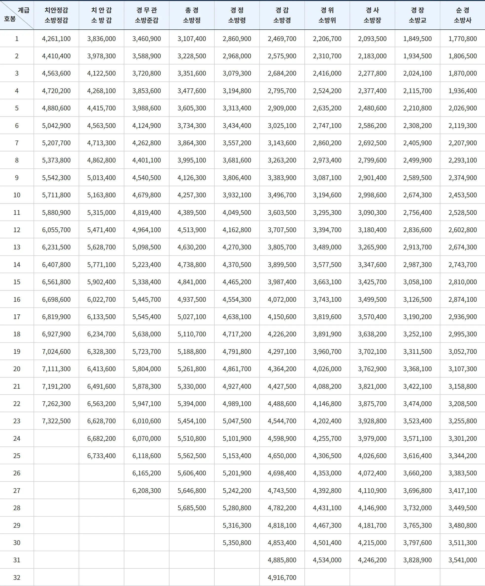 2023년 기준 경찰·소방공무원의 봉급표는 아래와 같습니다. (이미지를 클릭하면 확대가 가능합니다.)