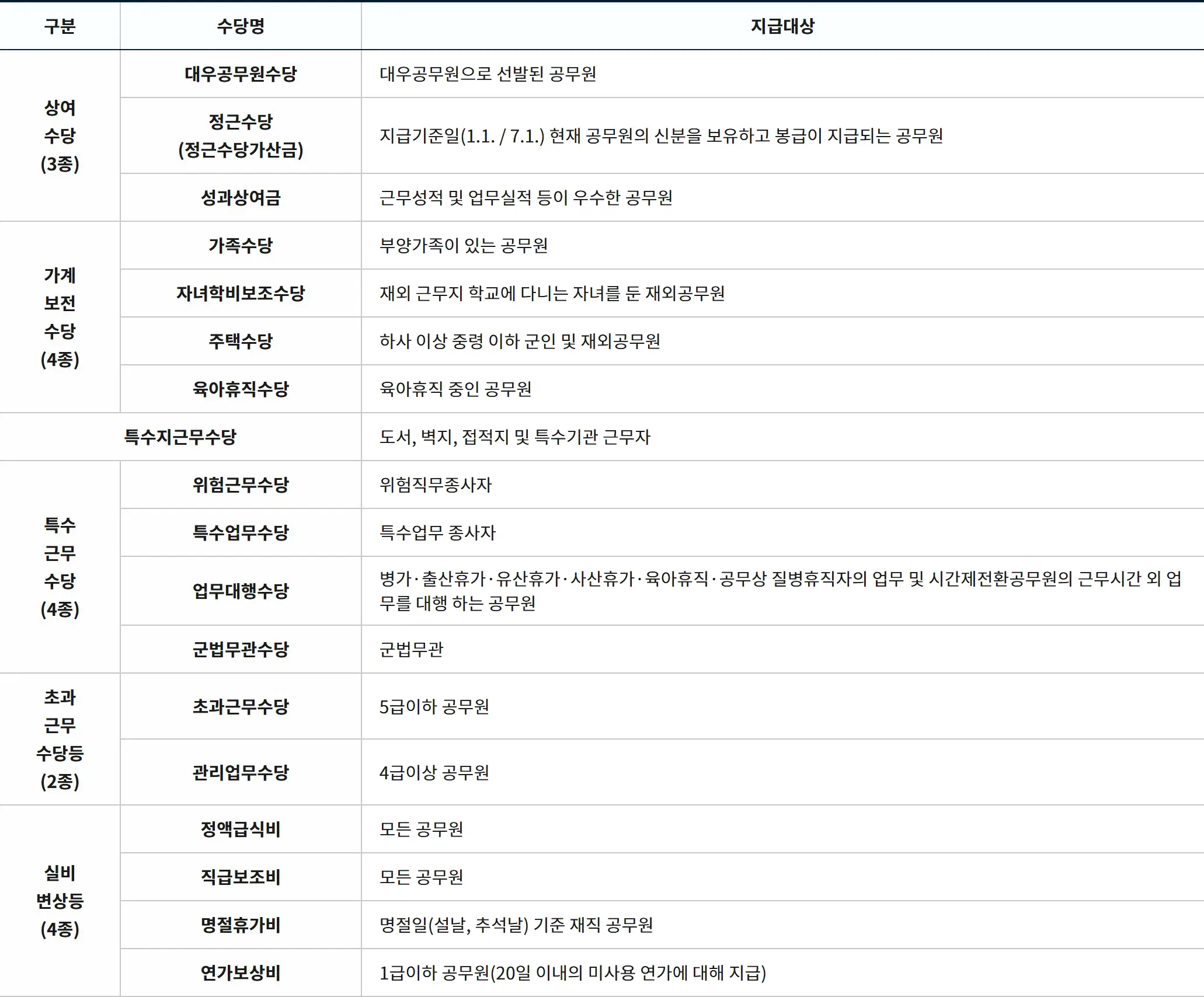 상여수당 3종, 가계보전수당 4종, 특수근무수당 4종, 초과근무수당 2종, 실비변상등 4종의 수당이 포함되며, 명절에는 봉급의 60%에 해당하는 명절 휴가비가 추가됩니다.