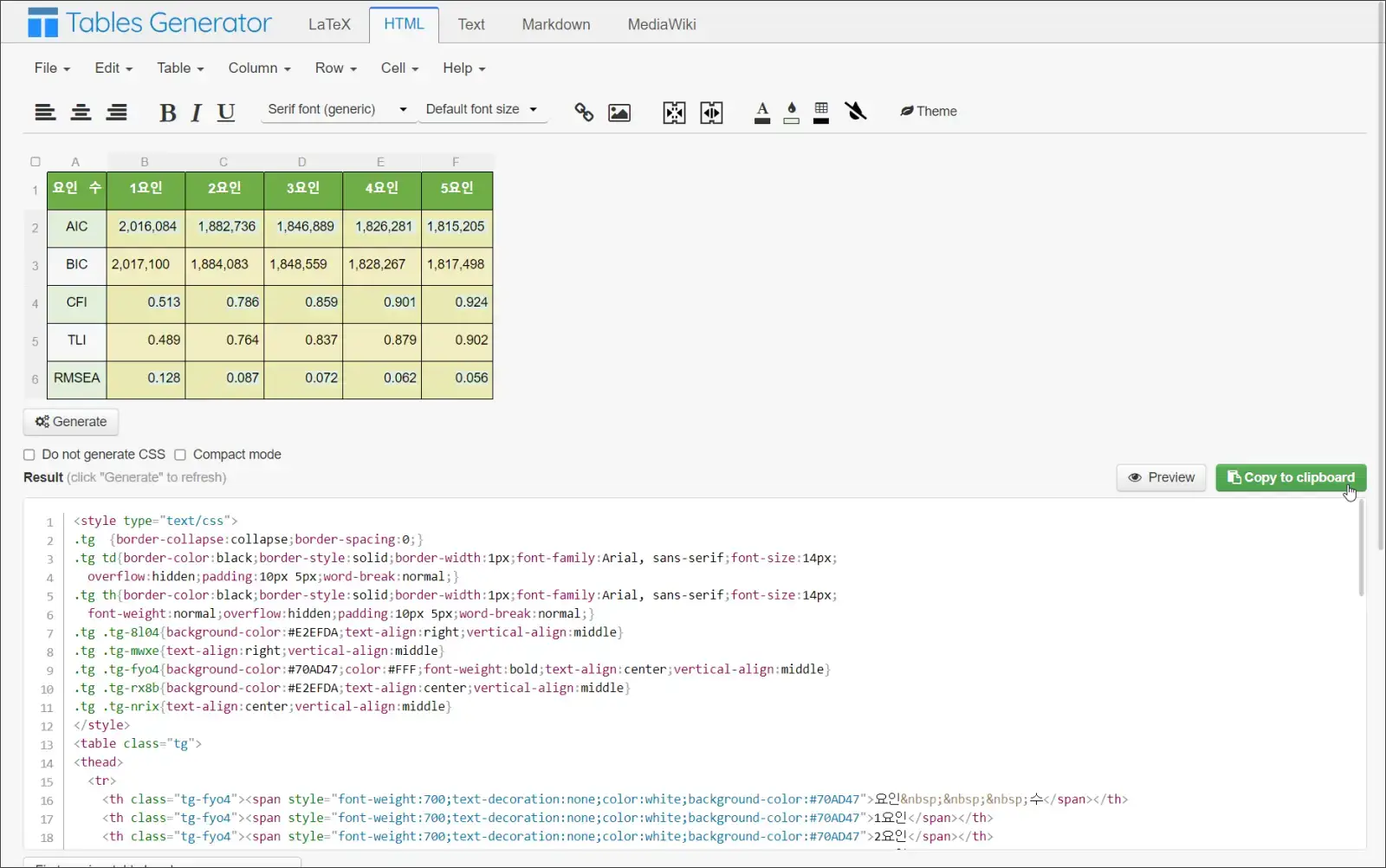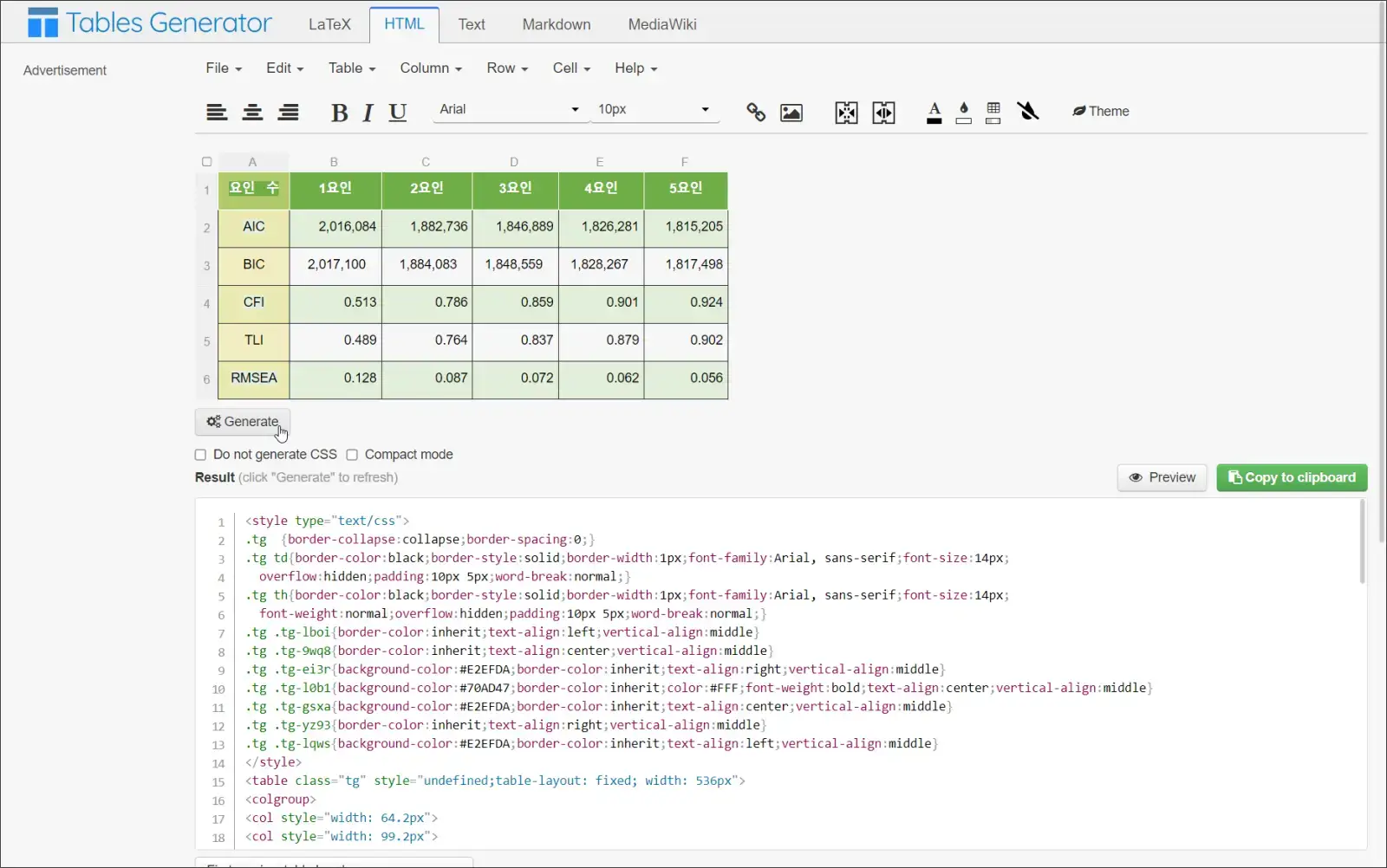 하단의 'Generate' 버튼을 클릭하면 표에 대한 내용이 아래의 HTML 코드로 생성됩니다.