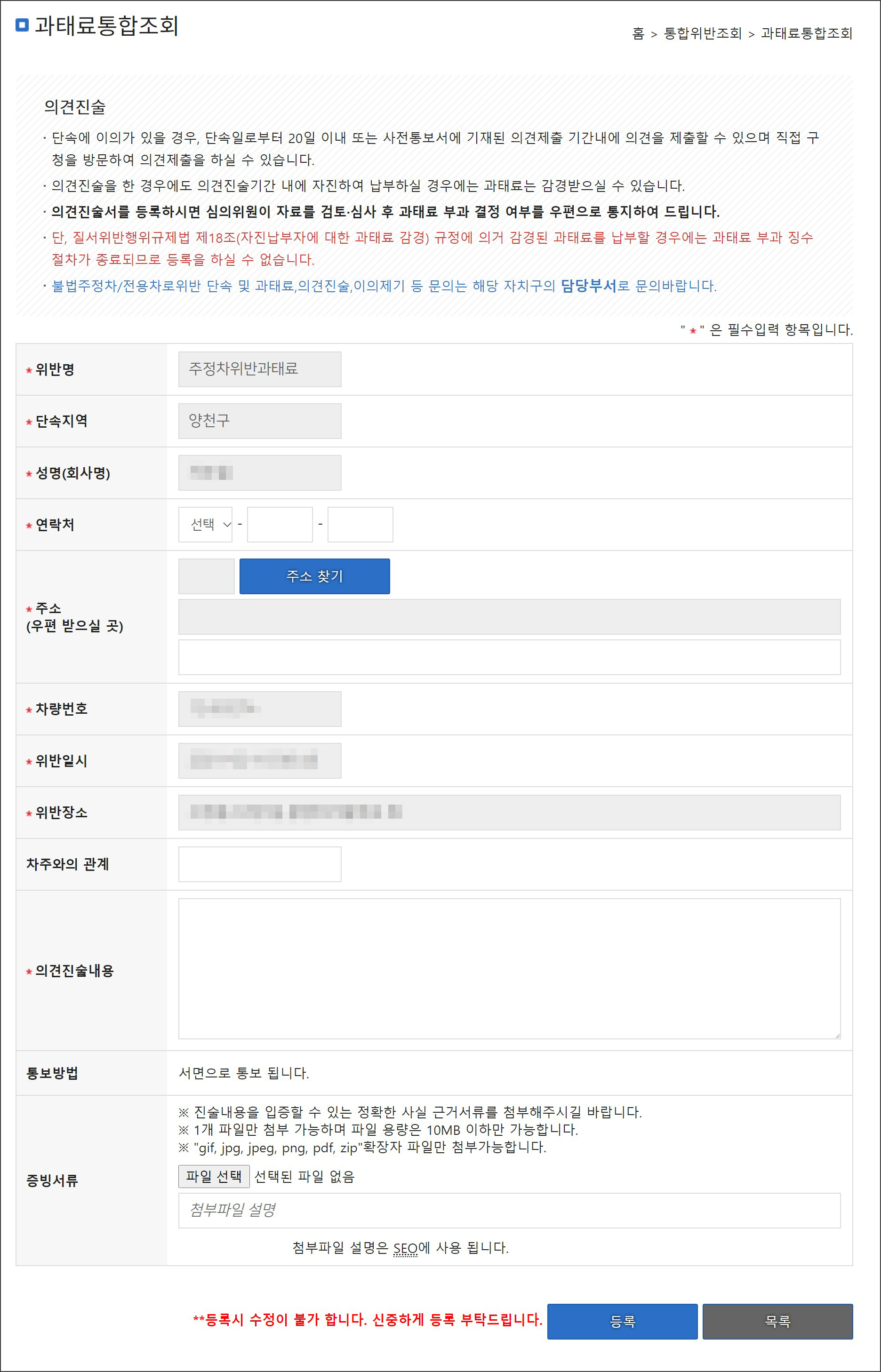 의견진술/이의제기 안내 불법주정차 및 전용차로위반 단속에 이의가 있을 경우 의견을 제출하실 수 있습니다. 의견진술/이의제기 안내