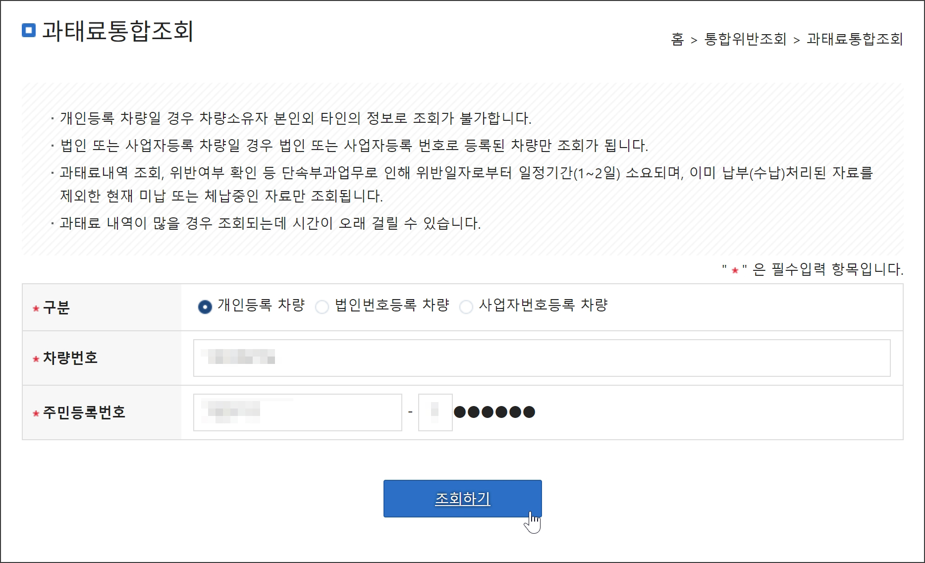 차량번호, 주민번호를 이용하여 해당 차량의 과태료를 조회할 수 있습니다.