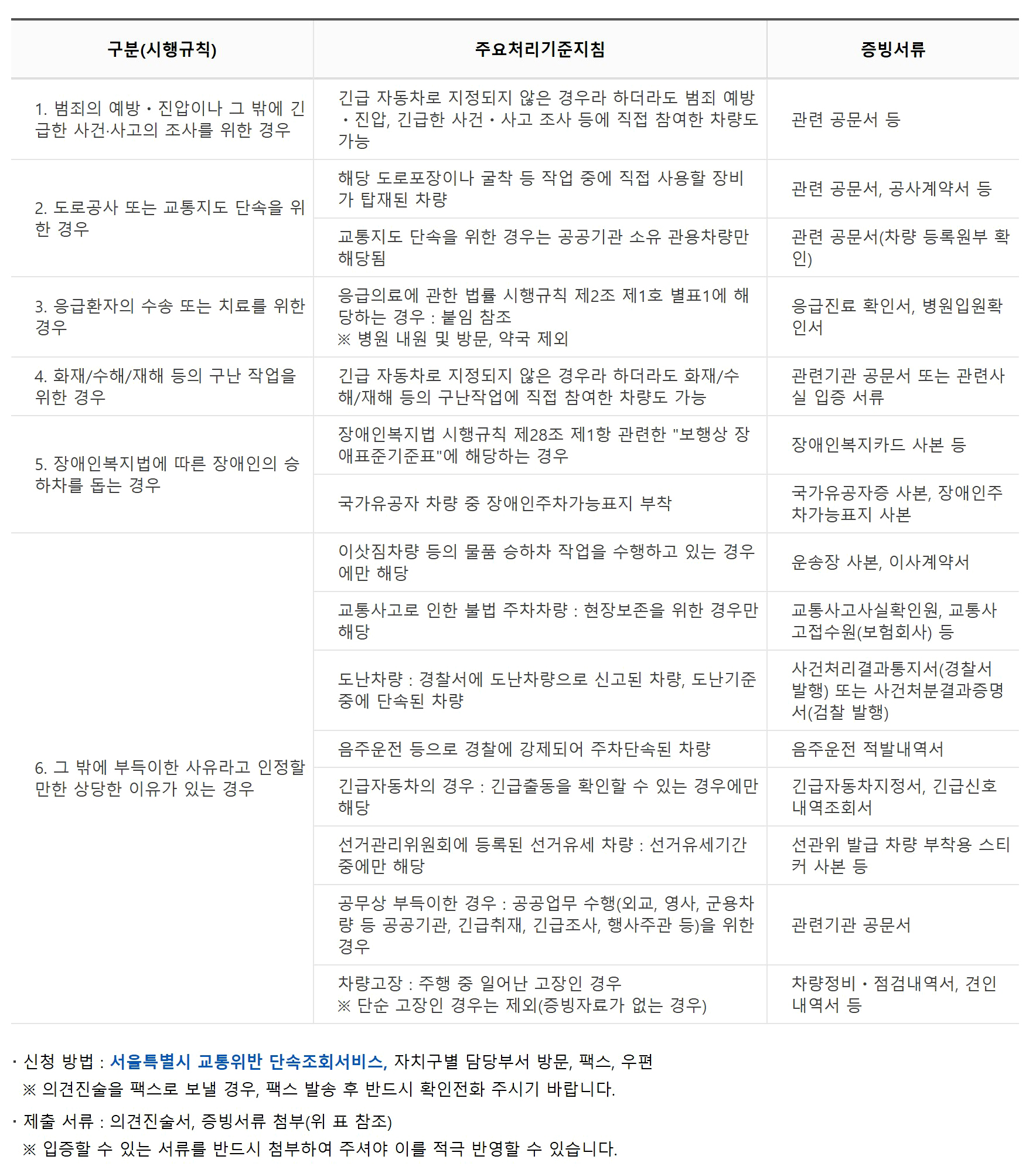 각 사유마다 해당하는 증빙서류를 준비하여 해당 구청의 주차관리과 또는 인터넷 홈페이지를 통해 의견진술을 진행할 수 있습니다.