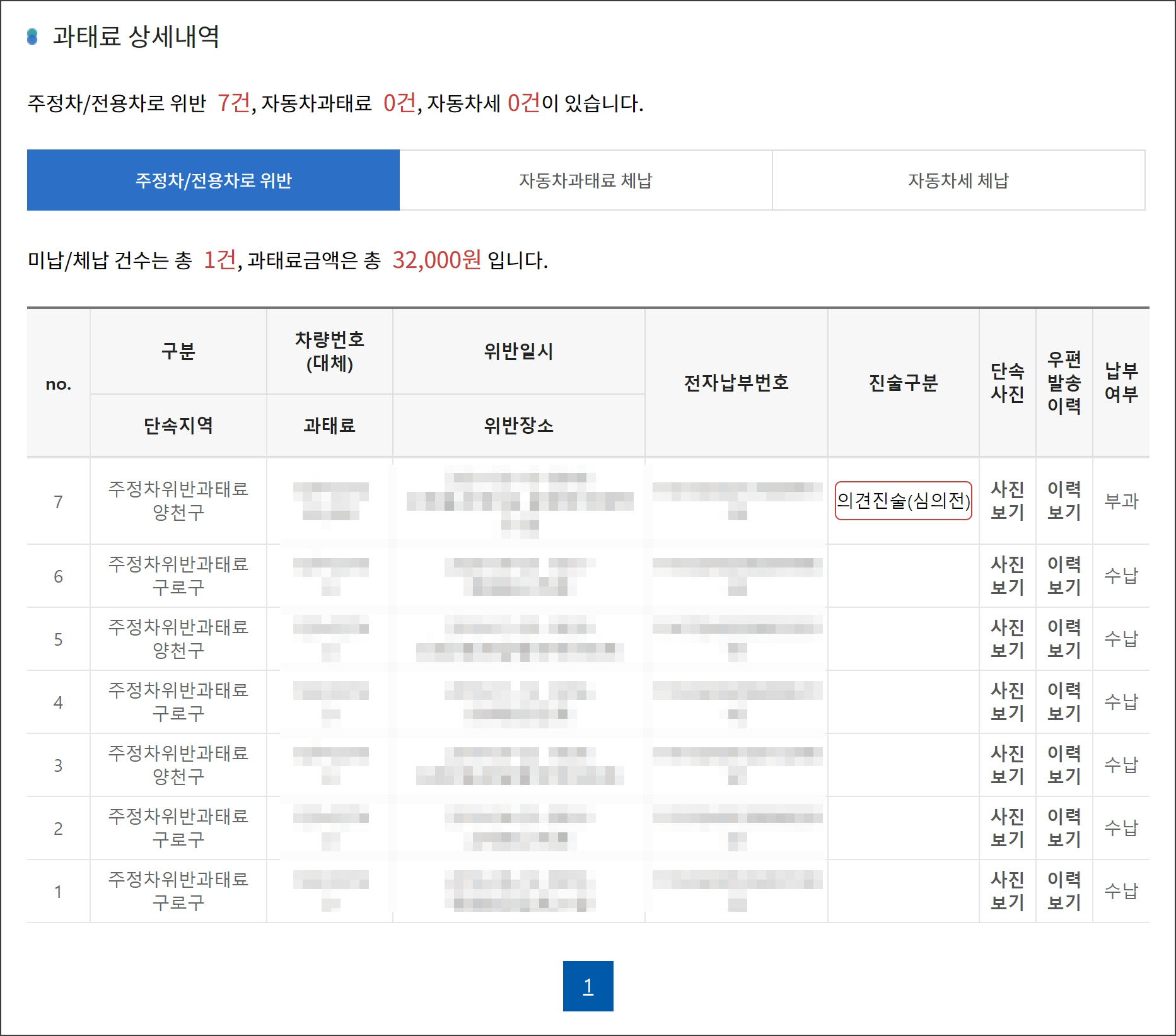 의견진술을 마치면 위와 같이 '심의전' 상태로 변경되며 제출한 의견진술을 확인할 수 있습니다. 심의가 진행되면 타당성을 따져 부과된 과태료에 대해 면제를 받을 수 있습니다.