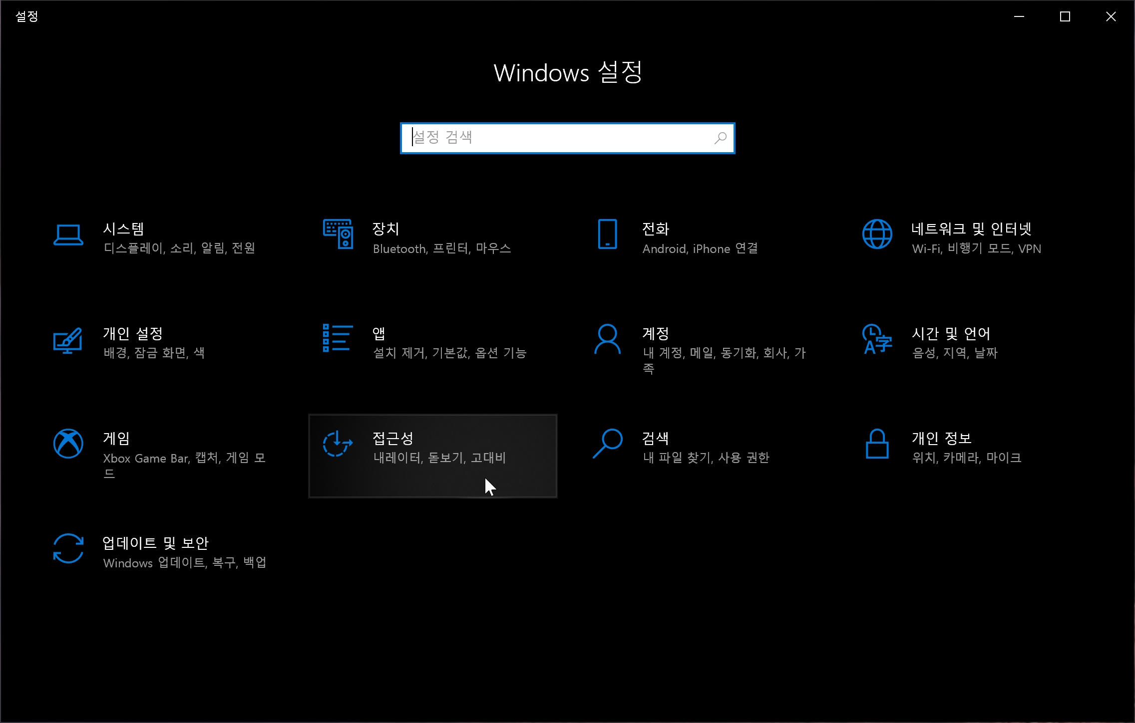 "윈도우10 화면 흑백 색상 모드 설정에서 해제"