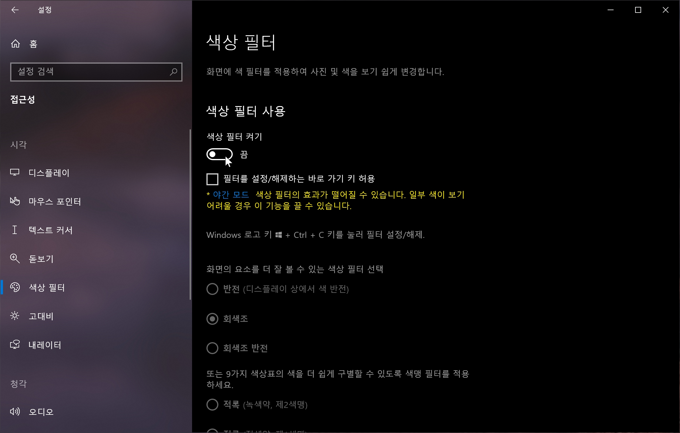 '색상 필터'를 켜고 '바로가기 키 허용'이 체크되어 있으면