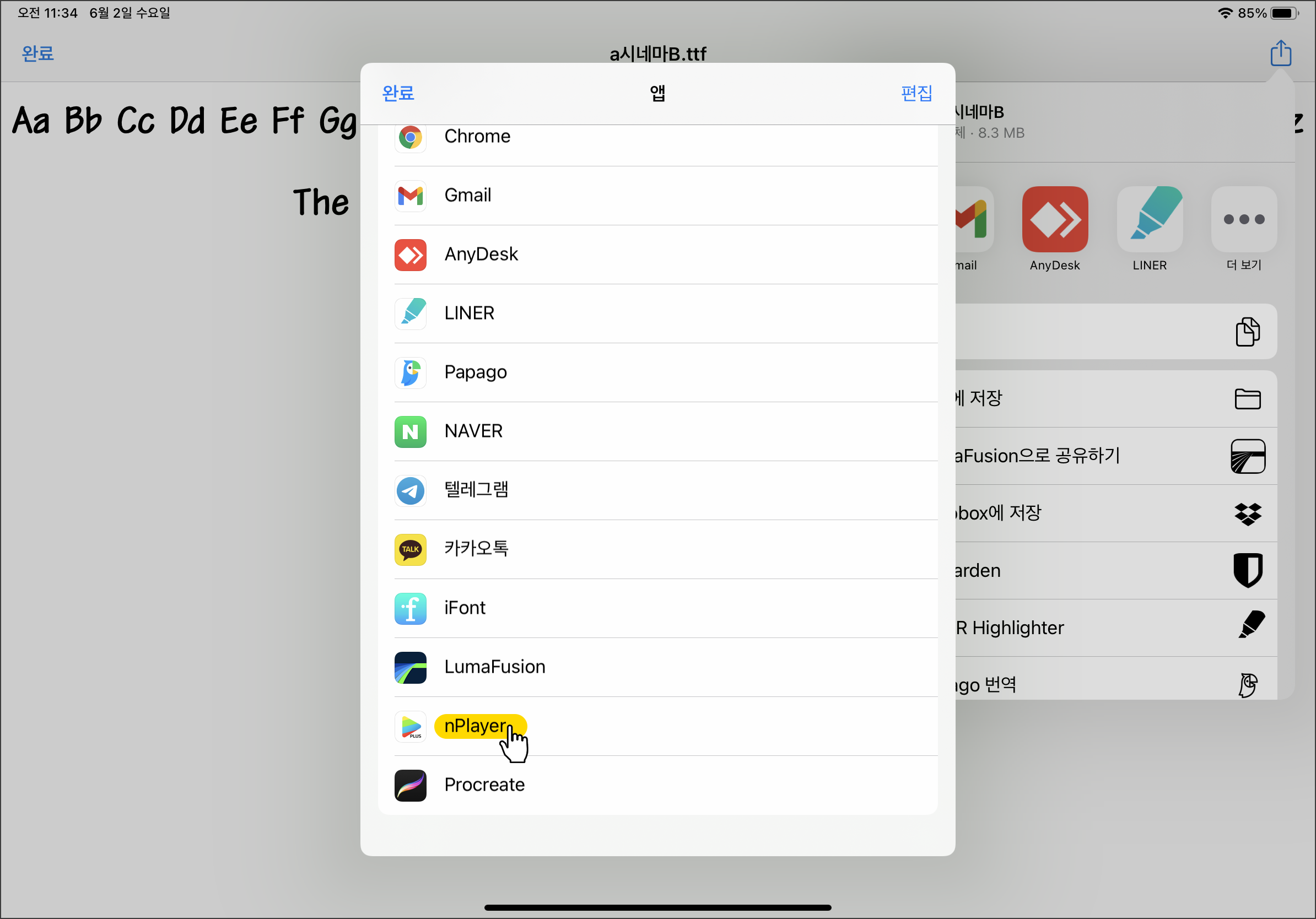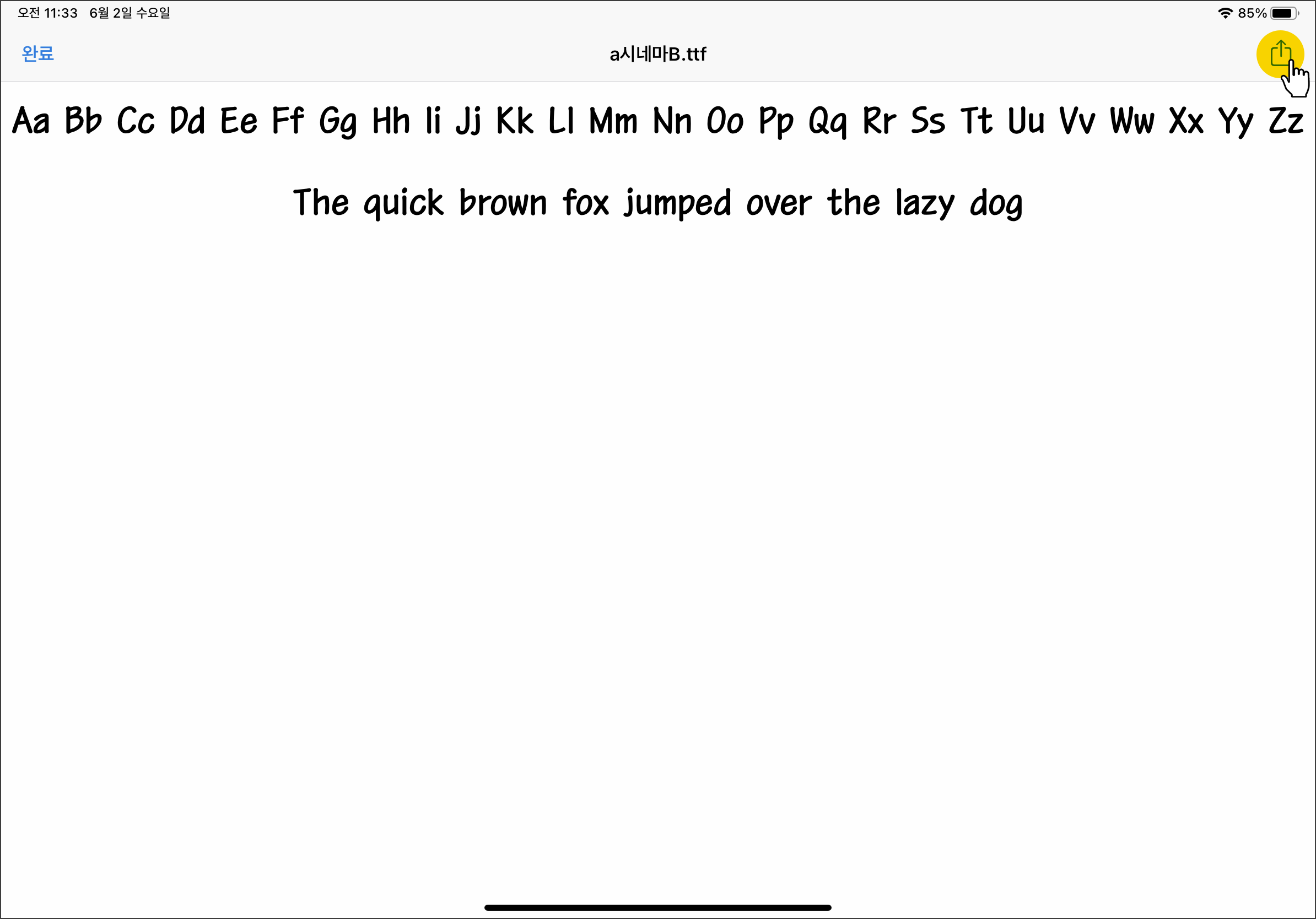 전송받은 폰트 파일을 열면 위와 같이 영문 글꼴 모양을 볼 수 있습니다. 우측 상단의 '보내기' 아이콘을 선택하여 nPlayer로 폰트를 보냅니다.