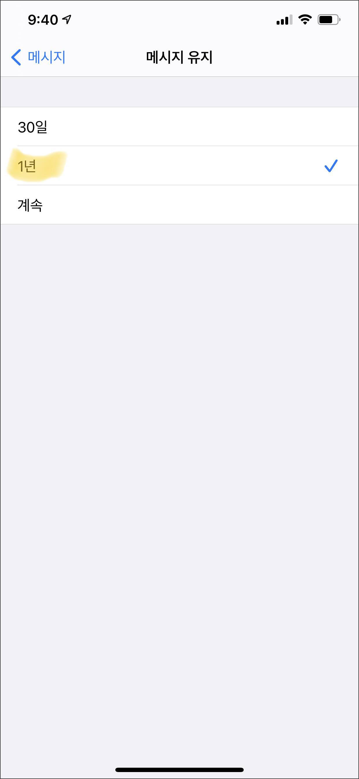 '설정 - 메시지 - 메시지 유지'로 이동하여 30일이나 1년 등 기간을 제한하면 더 이상 오래된 메시지가 저장되지 않습니다. 오래된 메시지가 삭제되면서 아이폰 네트워크 속도 향상을 기대할 수 있습니다.