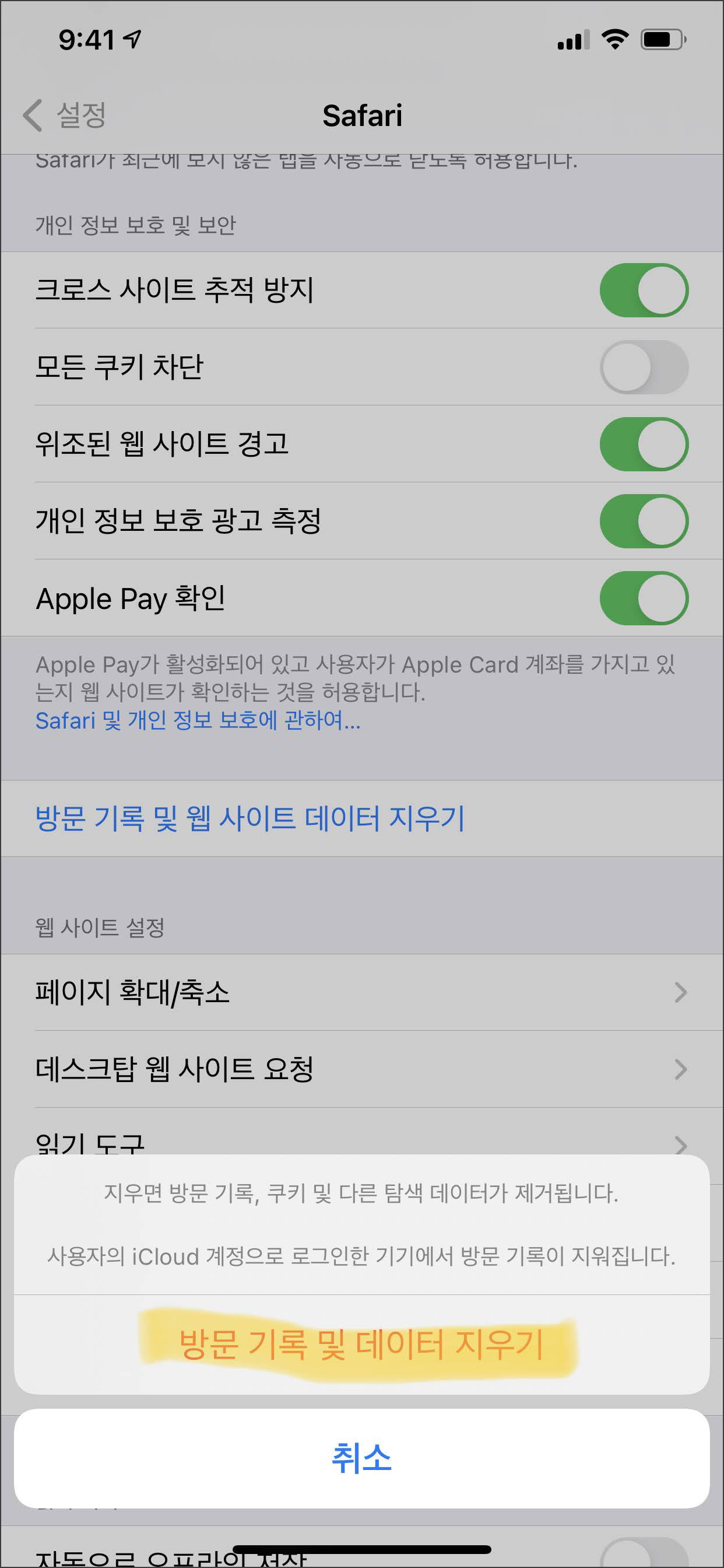 아이폰 인터넷 브라우저인 '사파리'에 불필요한 방문 기록이나 쿠키 등 데이터가 쌓이면 아이폰 속도가 느려질 수 있습니다. 방문 기록과 데이터는 주기적으로 삭제하여 주는 것이 좋습니다.