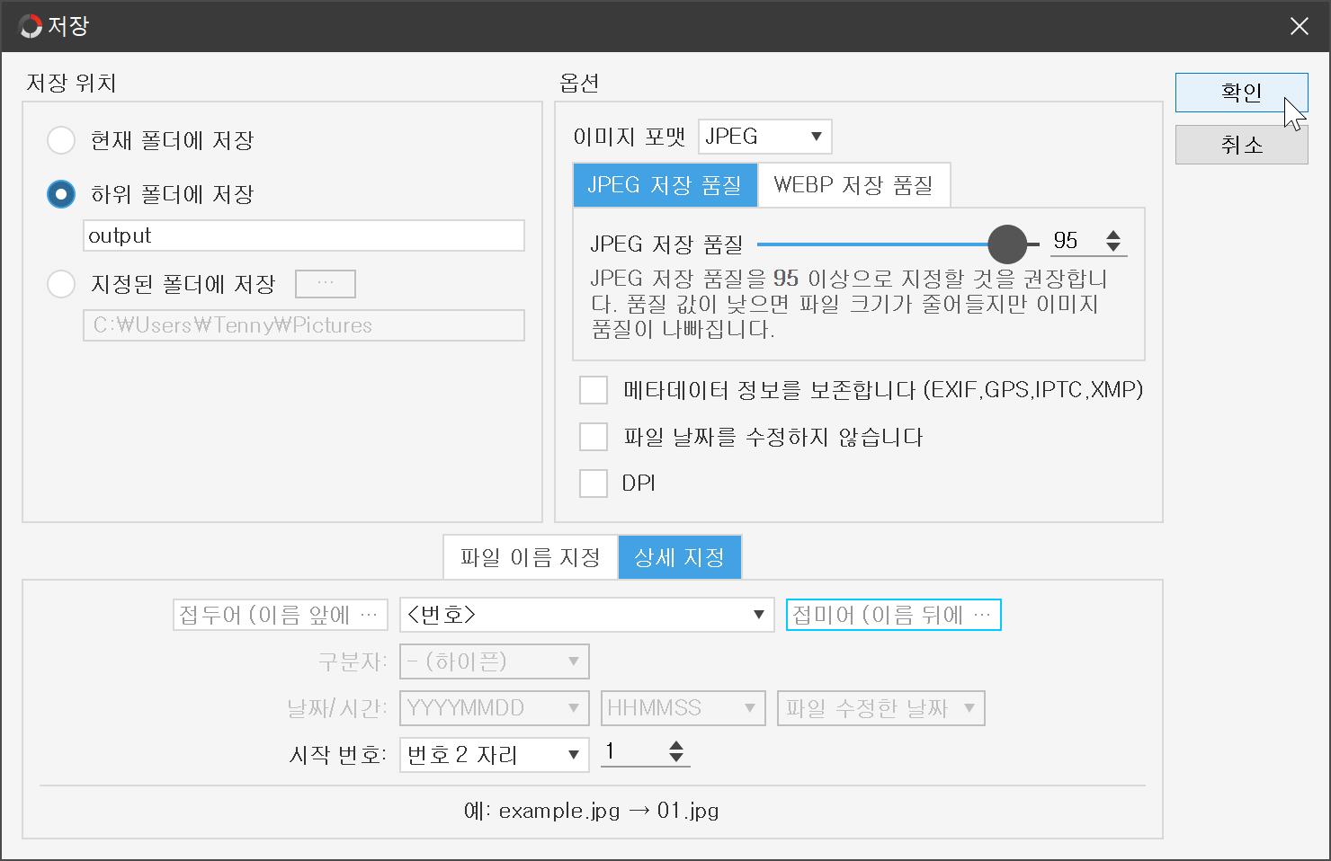 저장 버튼을 누르면 위와 같이 저장될 폴더 위치와 이미지 포맷 및 품질, 파일명 등을 지정할 수 있습니다. 이 외에도 워터마크 삽입 등 다양한 기능을 제공하고 있습니다.