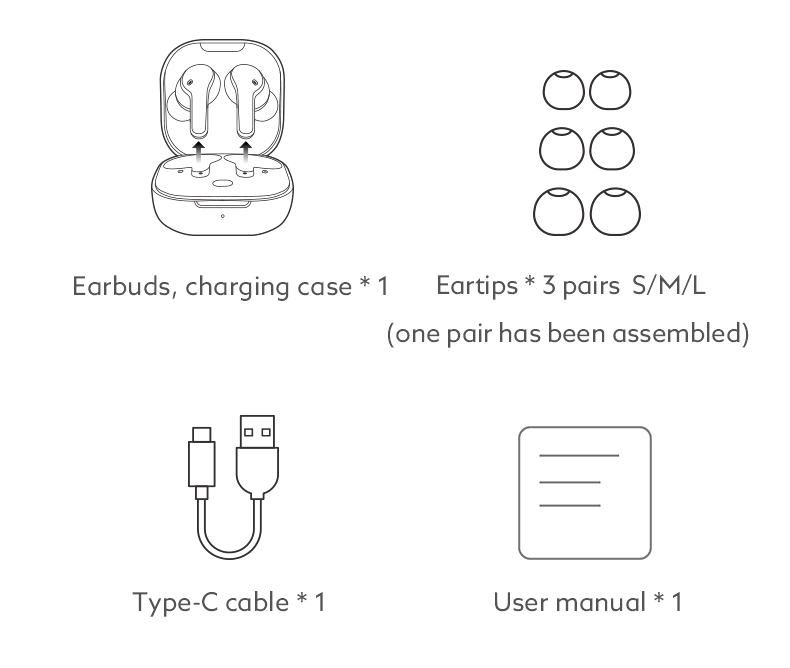 구성품은 이어버드, 충전케이스, 여분의 대/중/소 이어팁, USB 타입-C 케이블, 매뉴얼이 동봉되어 있습니다.