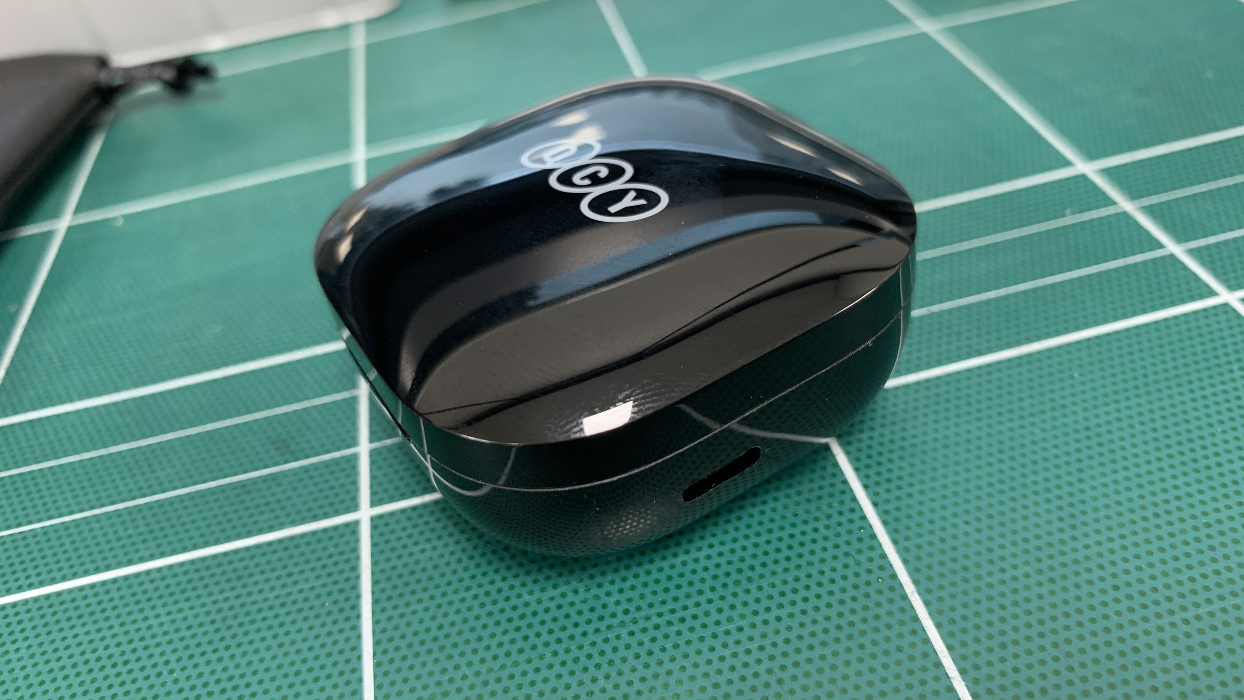 충전케이스에는 QCY 로고가 인쇄되어 있고, 유광 재질로 마감이 되어 있습니다.