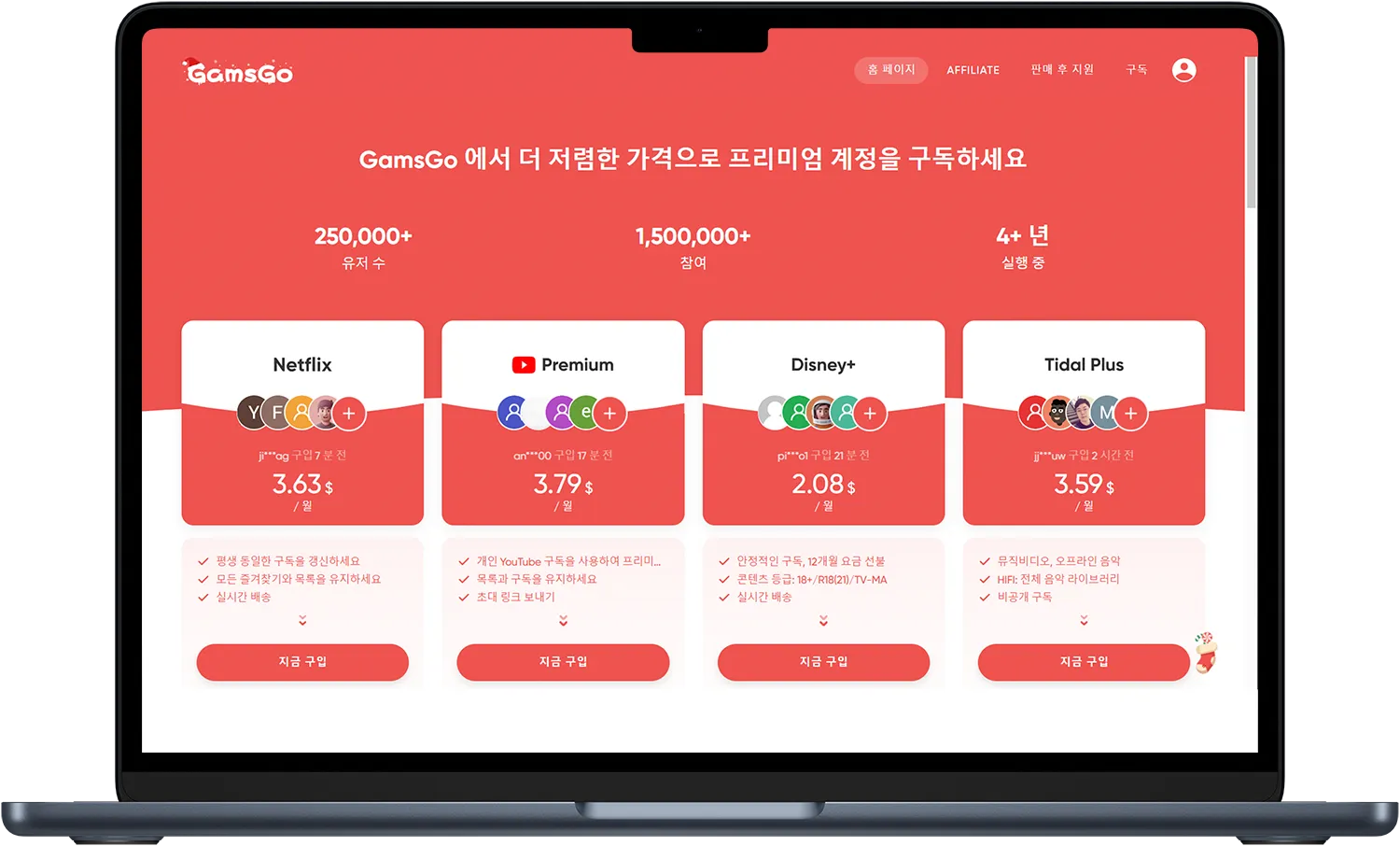 지금 바로 겜스고에 가입하시고, 넷플릭스, 디즈니+, 유튜브 프리미엄 등의 다양한 서비스를 즐겨보세요!