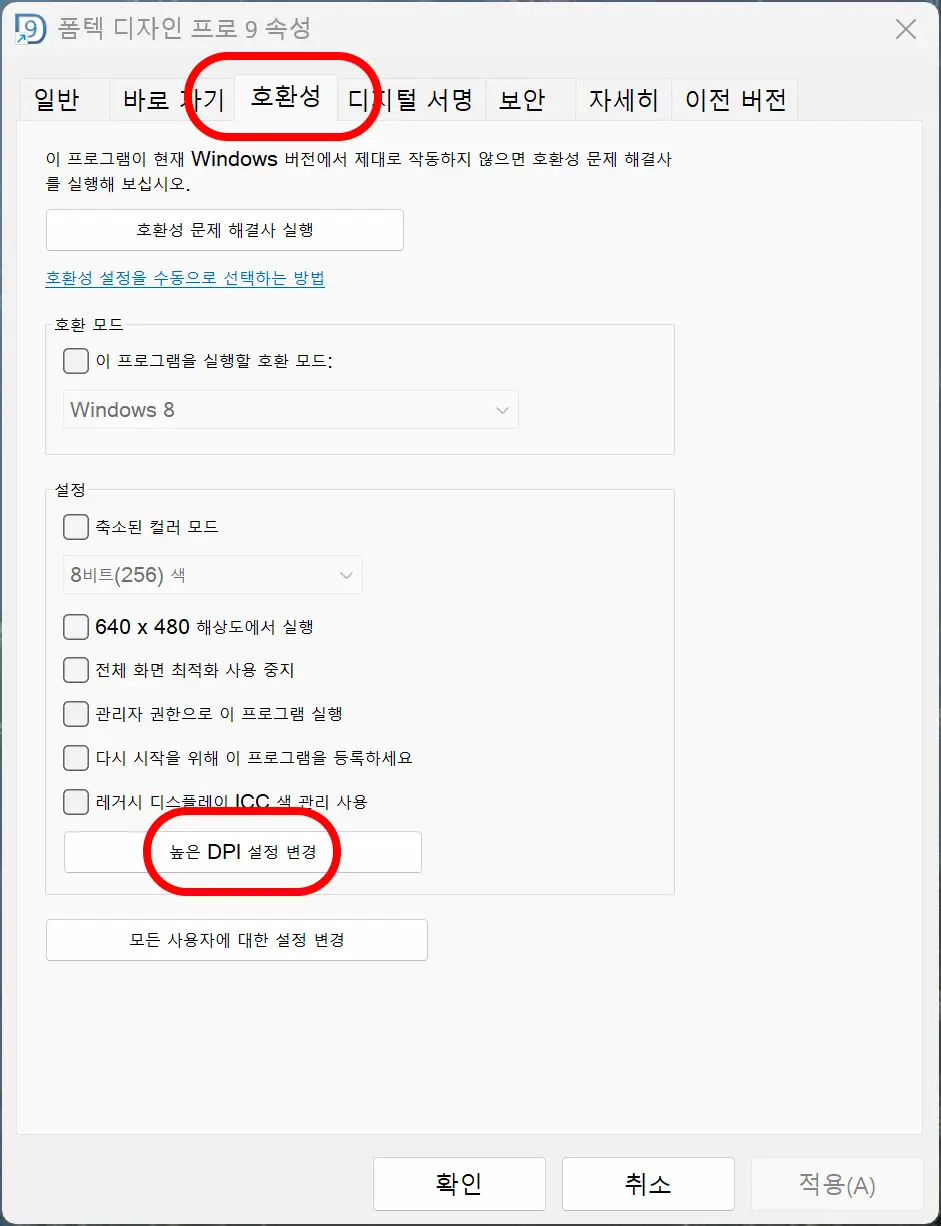 특정 프로그램의 DPI 문제는 대부분 해당 프로그램의 속성 창에서 해결할 수 있습니다.