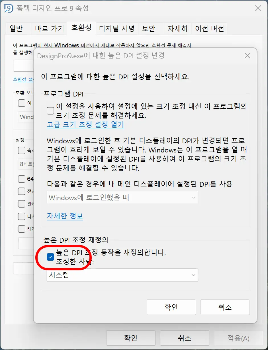 - ‘높은 DPI 조정 동작을 재정의합니다’ 항목에 체크
