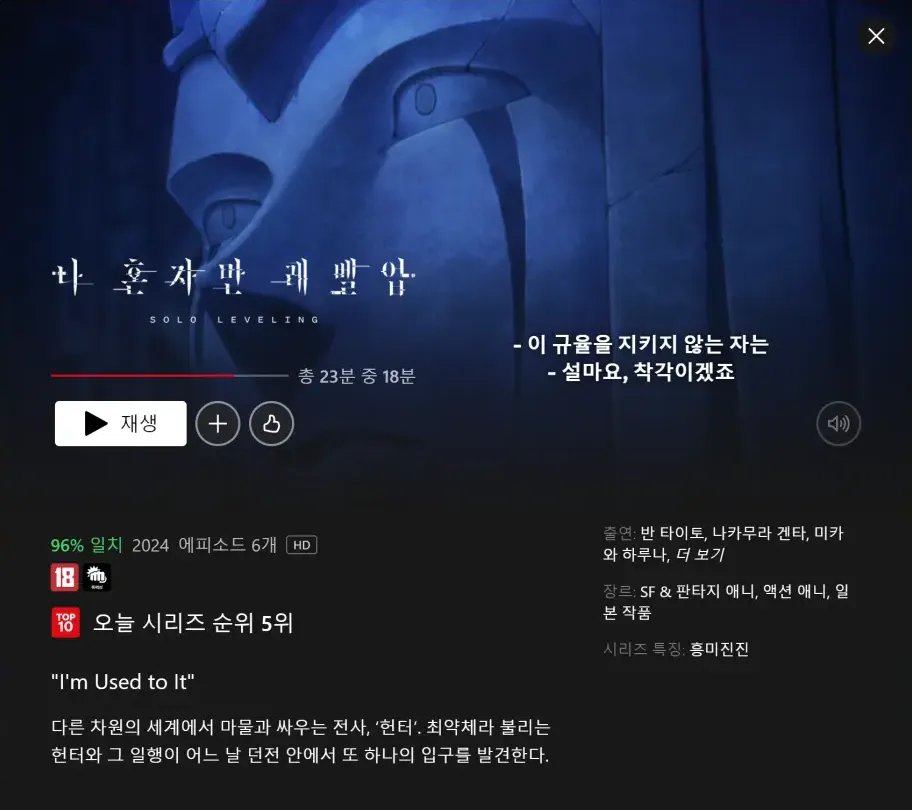 구독형 OTT서비스인 넷플릭스에서 '나 혼자만 레벨업' 에피소드가 서비스됩니다.