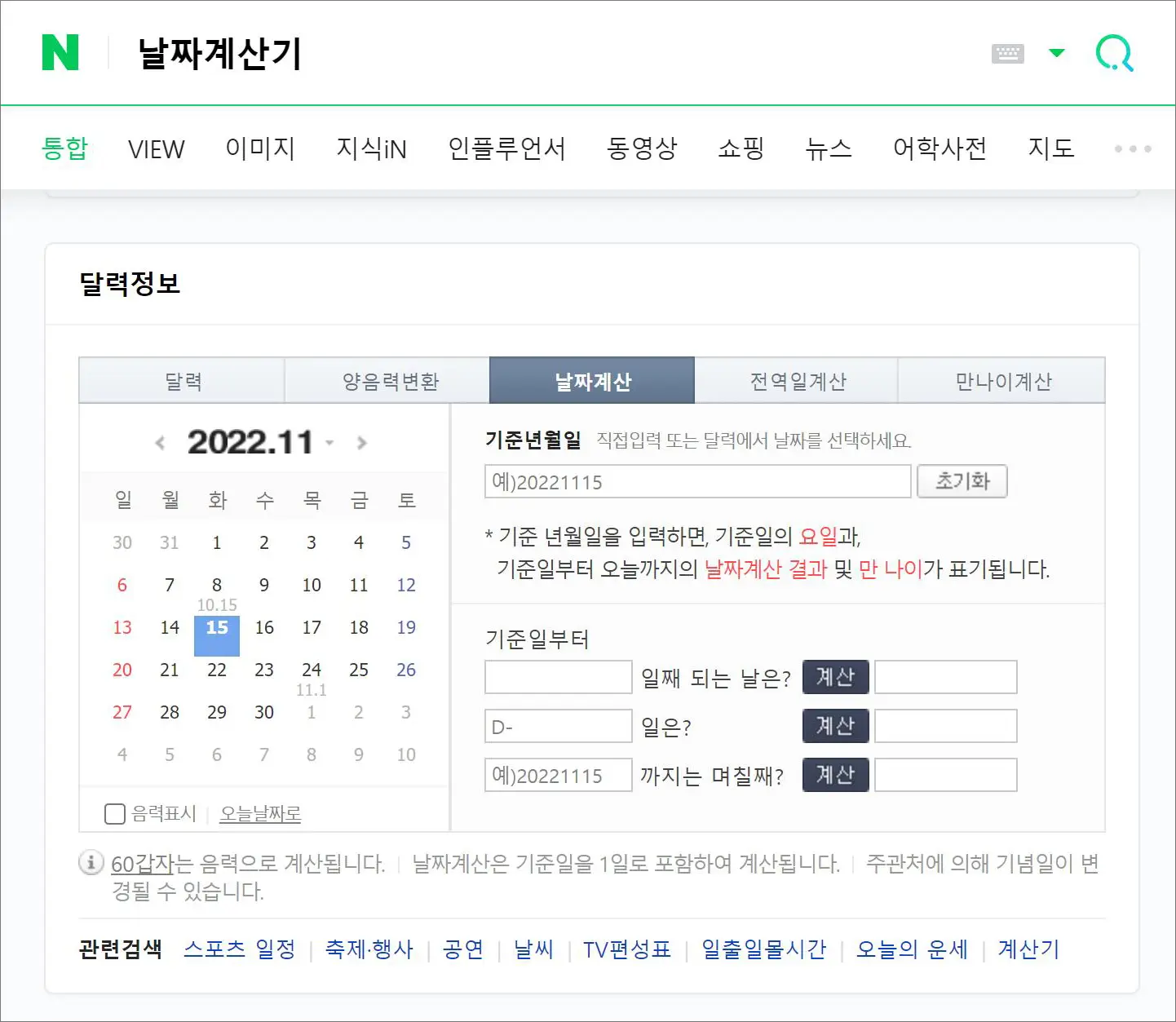 PC나 모바일에서 '날짜계산기'라고 검색을 하면 '네이버 달력'이 보이고, 상단의 '날짜 계산' 탭에서 날짜 계산이 가능합니다.