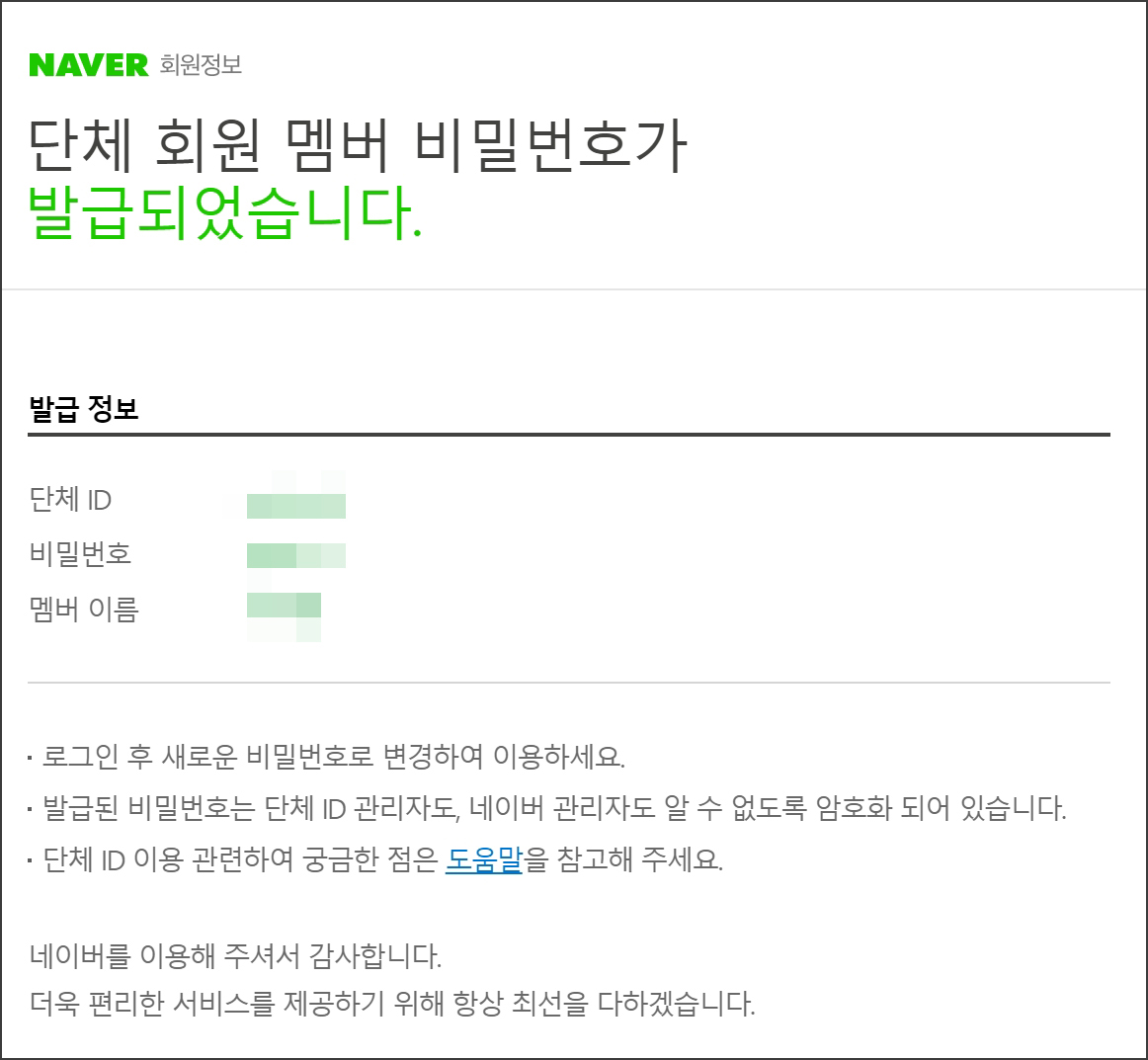 그러면 위와 같이 단체 회원 멤버 비밀번호를 발급받아 네이버에 단체 아이디로 로그인이 가능합니다. 로그인 후 본인이 원하는 비밀번호로 변경하여 이용할 수 있습니다. 이 비밀번호는 멤버 각자 사용하는 것이기 때문에 관리자가 알 수 없으며, 알려줄 필요도 없습니다.