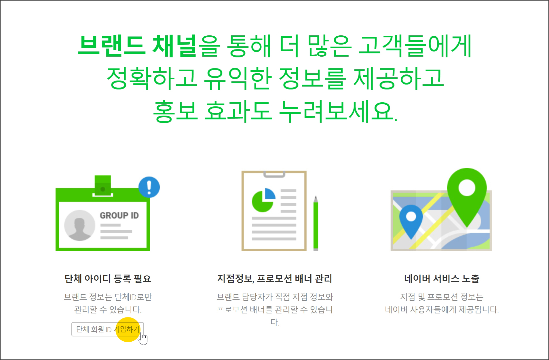 네이버 브랜드채널에서 단체 아이디 등록을 시작할 수 있습니다. 아래 링크를 통해 진행이 가능합니다.
