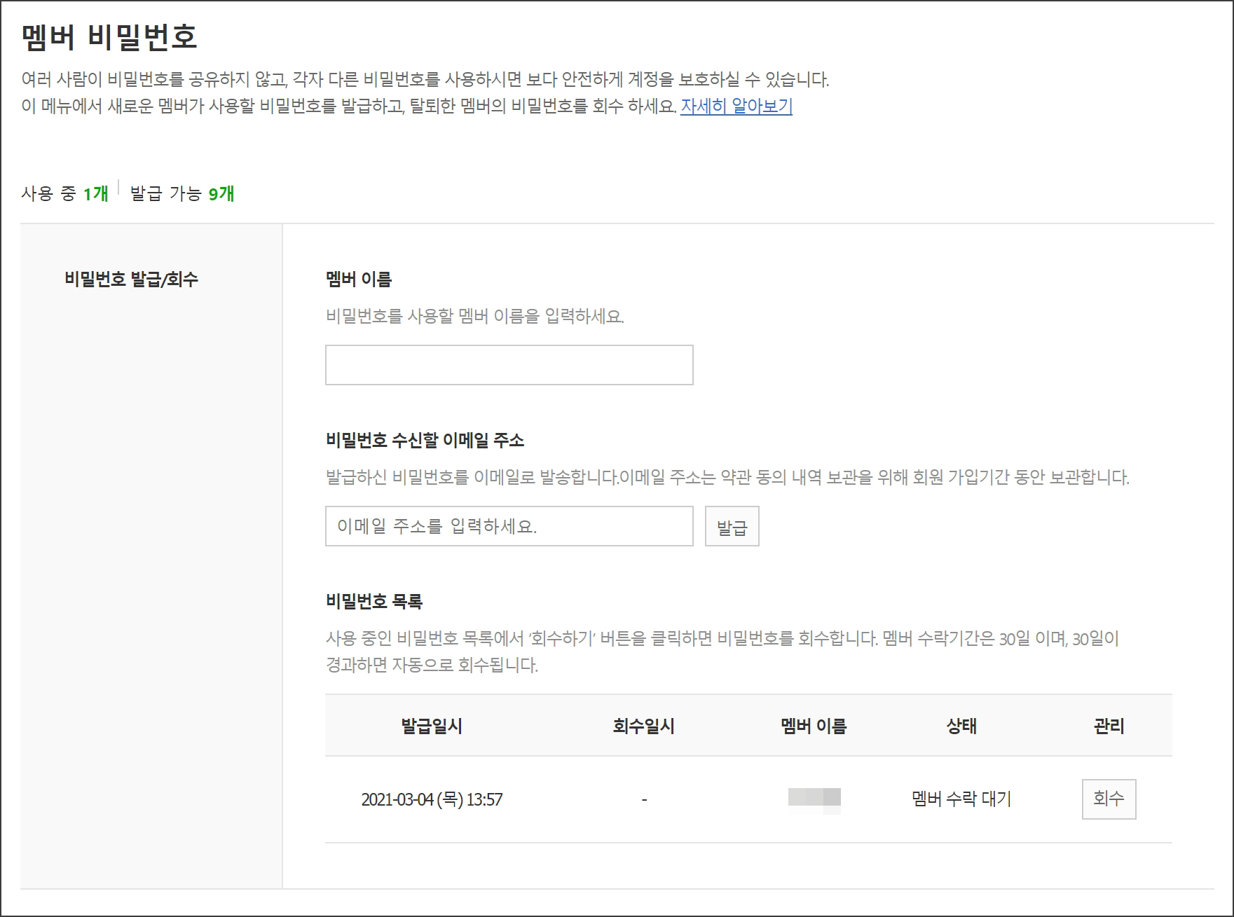 멤버 이름이나 호칭을 입력한 후 해당 멤버의 이메일 주소를 입력합니다. 관리자는 추수 필요에 따라 '회수' 버튼을 눌러 해당 멤버의 관리권한을 회수할 수 있습니다.