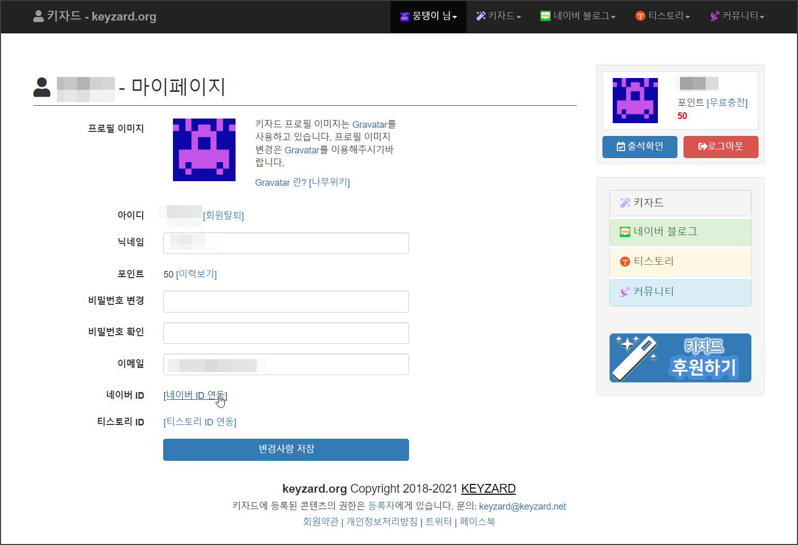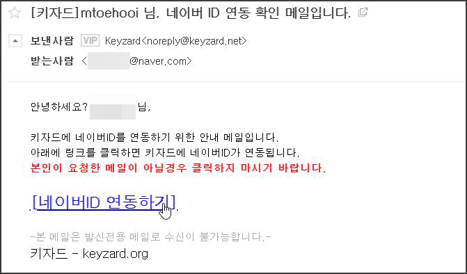 위와 같이 메일함에 도착한 연동 확인 메일이 링크를 클릭하면 키자드(keyzard)에 네이버 ID 연동이 됩니다.