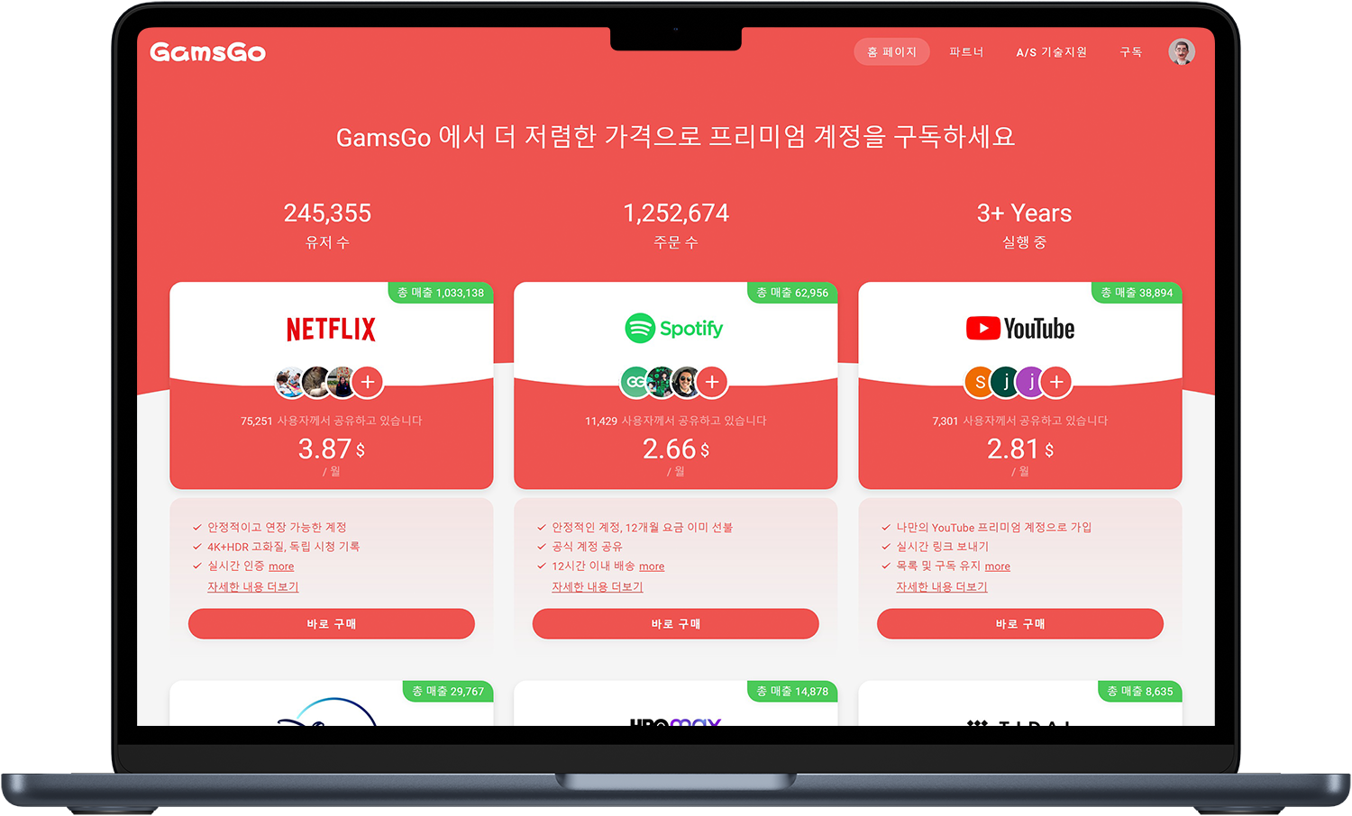 이제, 저렴하게 넷플릭스, 유튜브 프리미엄, 스포티파이, 디즈니 플러스 등의 서비스를 이용할 수 있습니다.