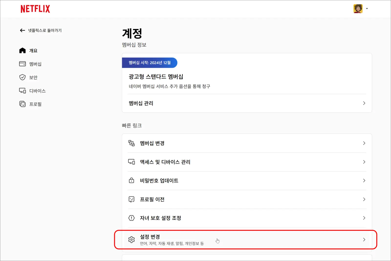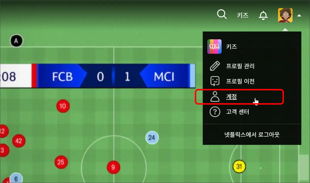 넷플릭스 홈페이지에 로그인 후 우측 상단의 프로필을 선택하고, '계정'설정으로 이동합니다.