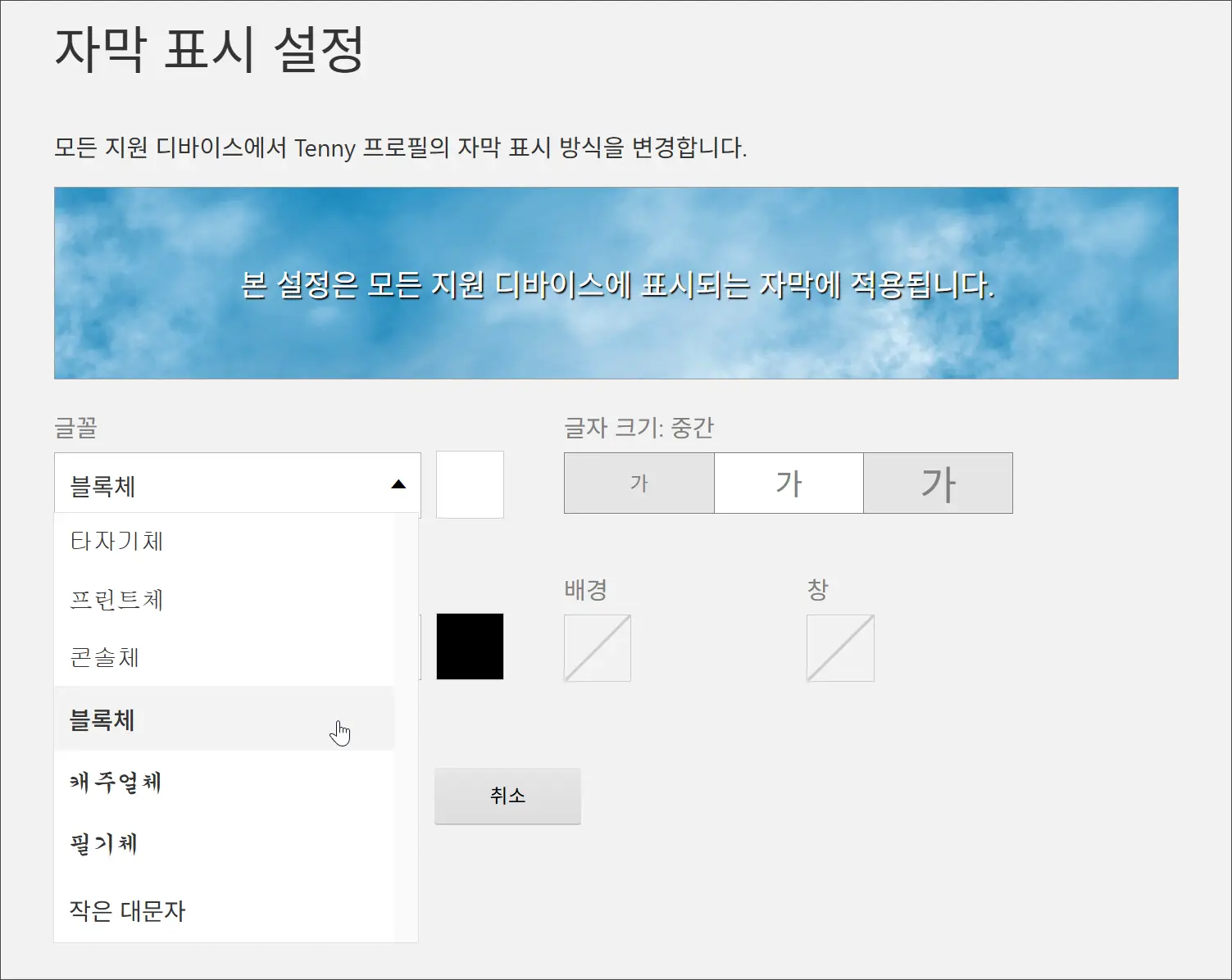 - 폰트 종류, 크기, 색상, 그림자, 배경, 창 등 다양한 옵션을 조절할 수 있어요. 미리보기로 바로 확인하며 원하는 대로 설정해보세요.
