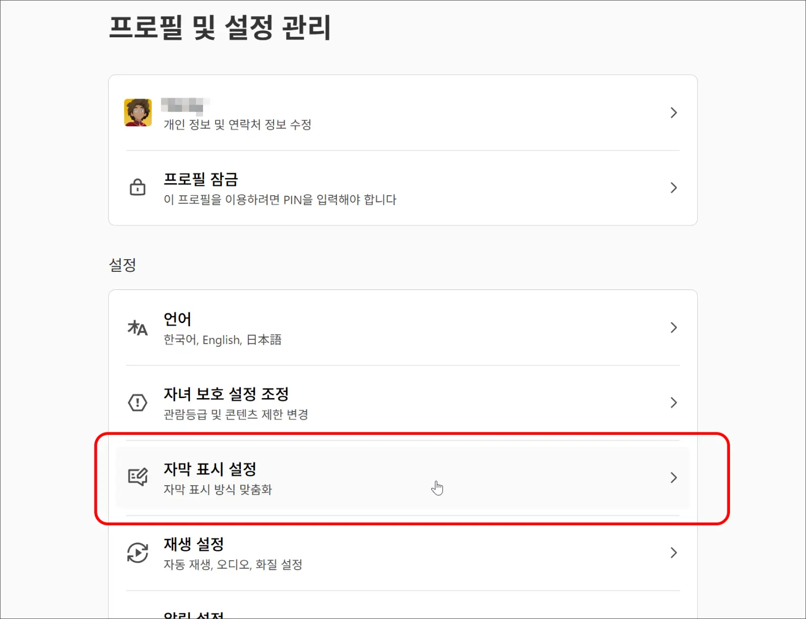 - '계정' 메뉴로 이동 후 '프로필 & 자녀 보호 설정'에서 해당 프로필의 '자막 표시'를 선택합니다.