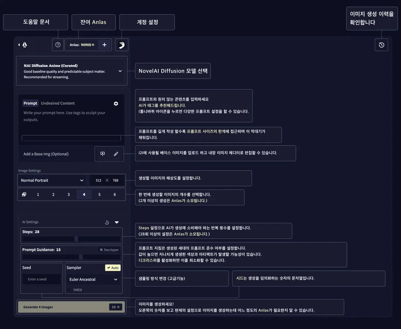 - 영어는 필수!: 아쉽지만 노벨 AI는 현재 영어 프롬프트만 지원한답니다.