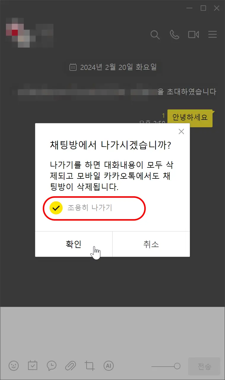 데스크톱 PC용 카카오톡에서는 아래의 방법으로 단톡방에서 조용히 나가기를 할 수 있습니다.