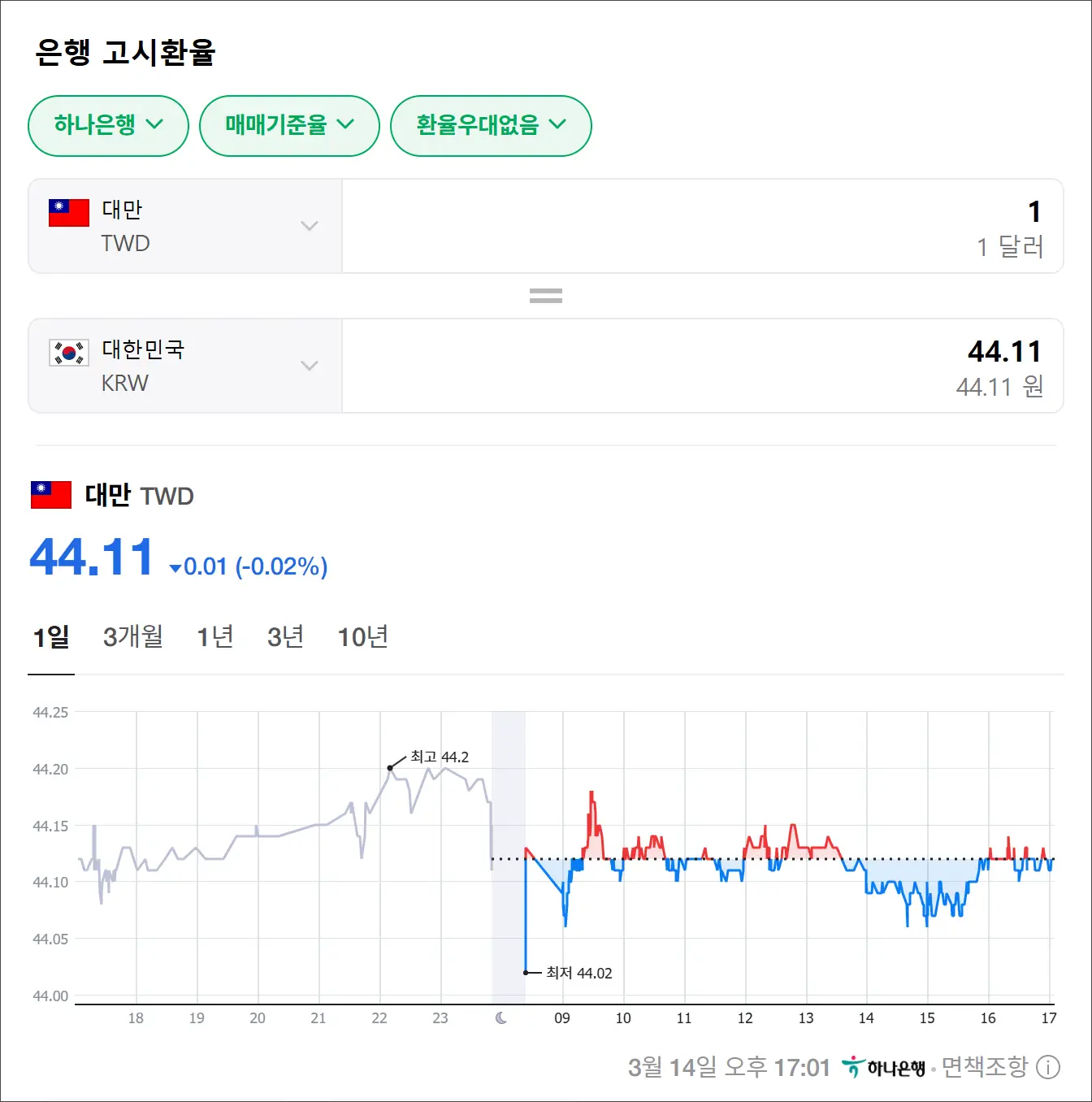 현재(2025년 3월 14일 기준) 1 TWD = 44.11 KRW 수준입니다.