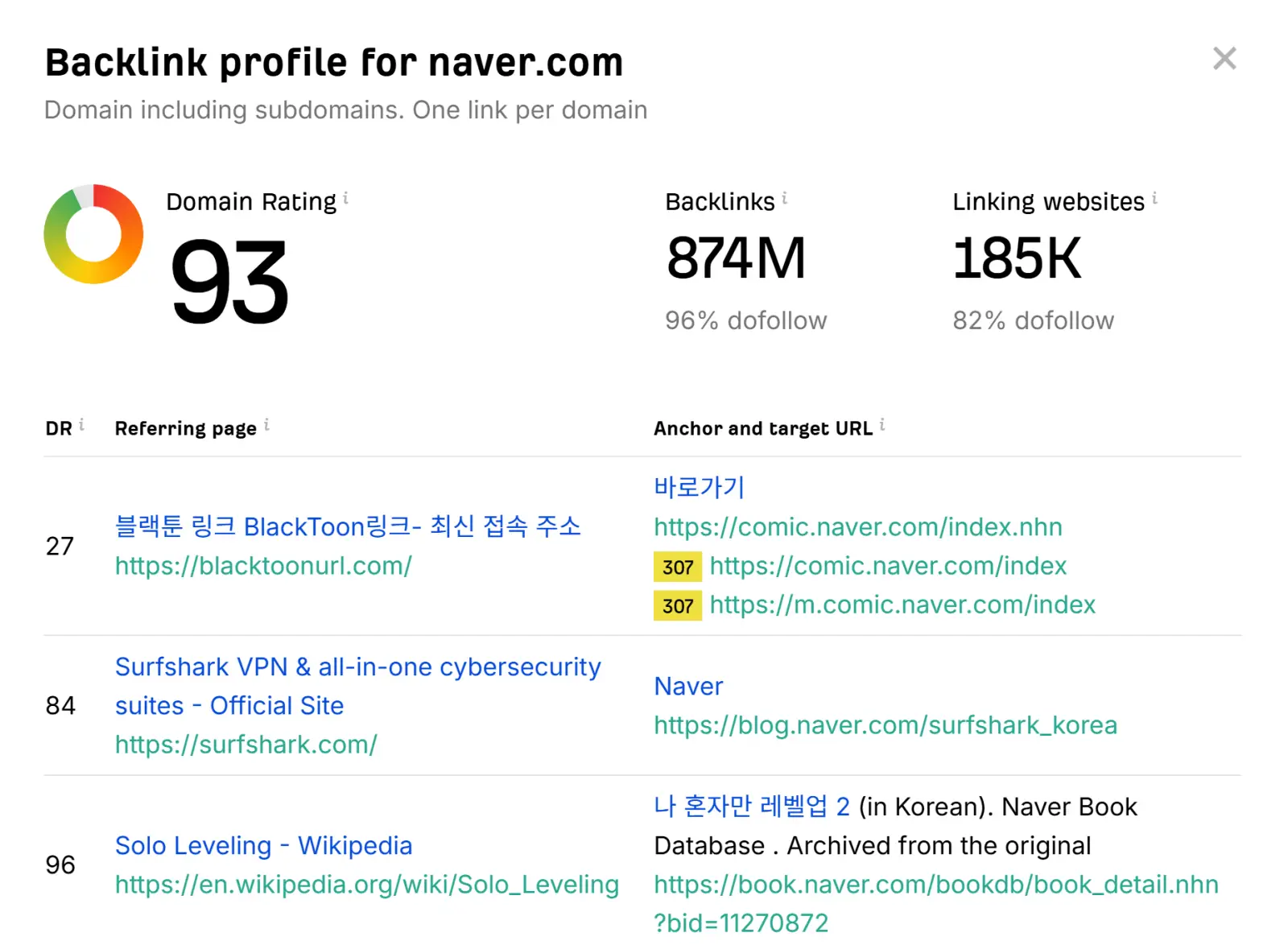 백링크가 DR에 얼마나 큰 영향을 미치는지 구체적인 사례를 통해 설명해 드릴게요. 이것만 이해해도 백링크의 '질'이 얼마나 중요한지 바로 아실 수 있을 거예요.