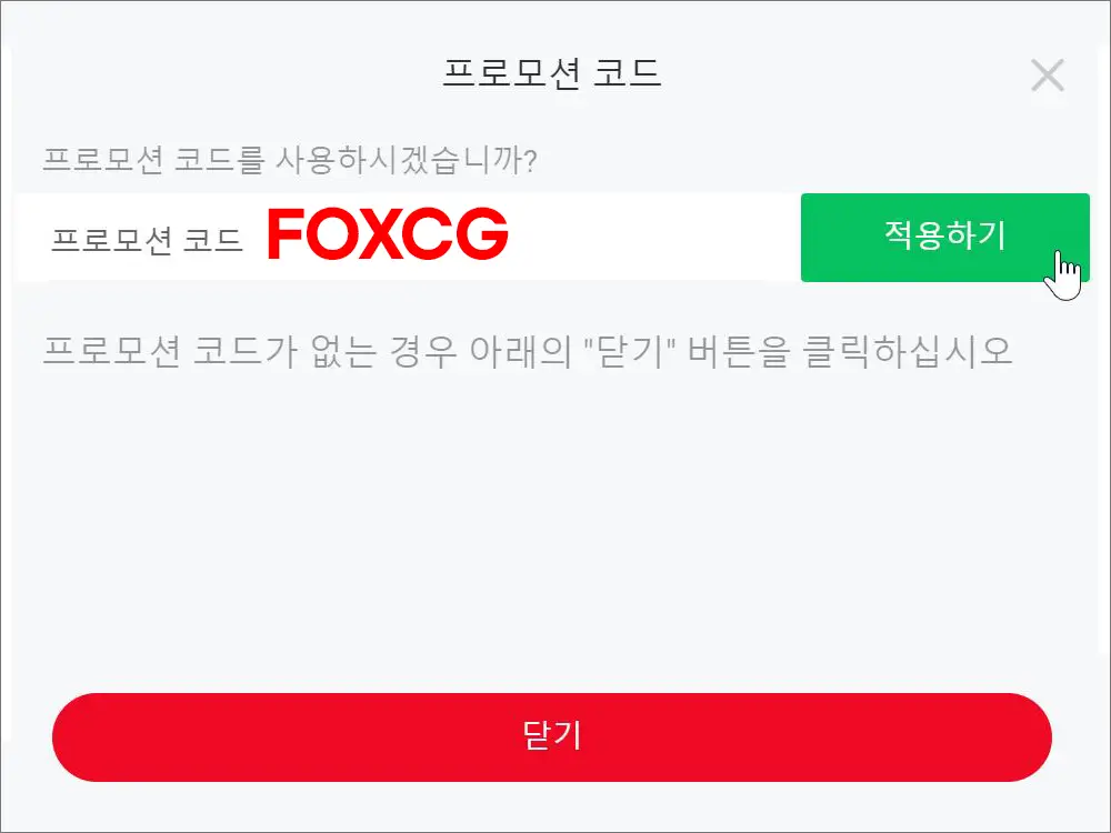 구입기간과 요금을 확인 후 프로모션 코드 입력창에 "FOXCG"를 입력합니다.