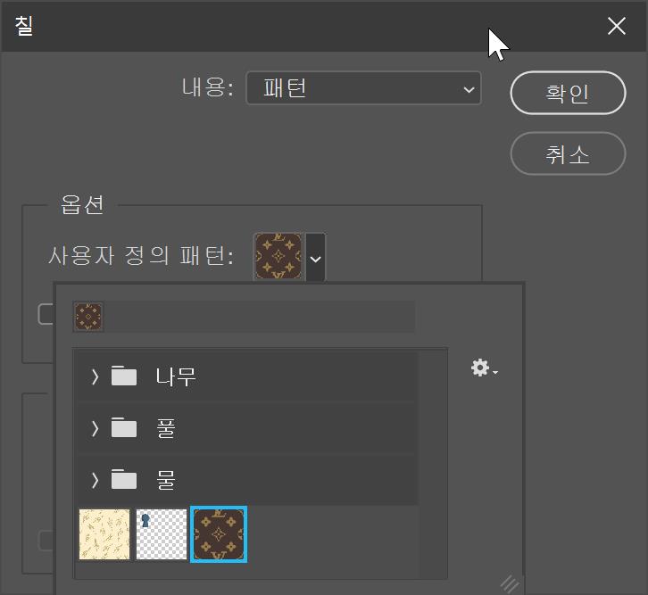 사용자 정의 패턴에 방금 만든 루이비통 패턴을 선택한 후 확인 버튼을 누릅니다.