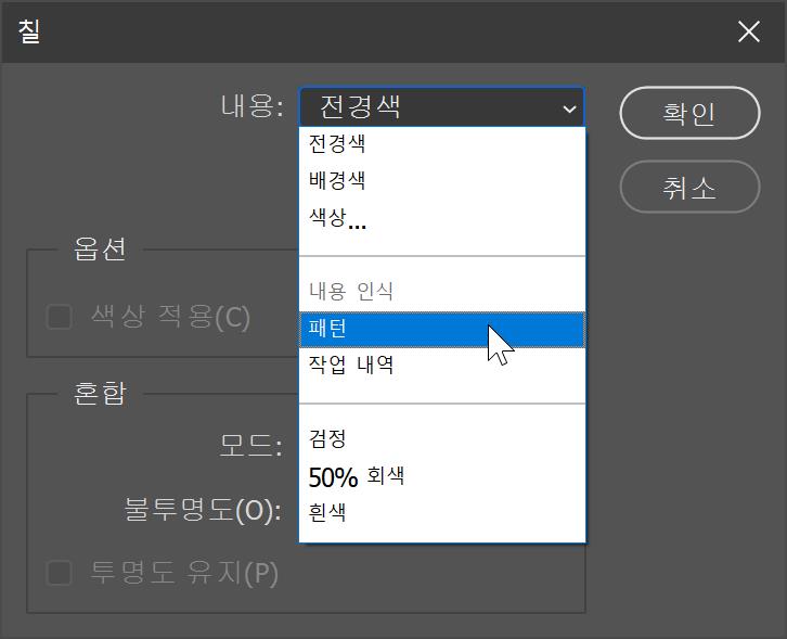 이제 원하는 부분에서 '편집' - '칠' ( Shift + F5 ) 를 선택하여 '패턴'을 선택합니다.
