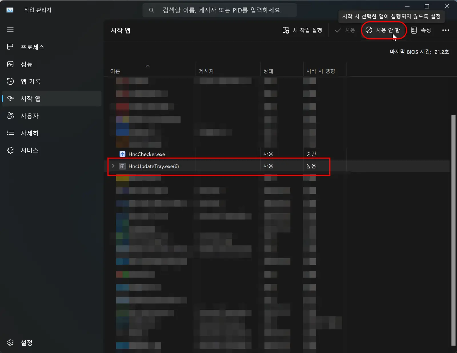 시작프로그램에서 'HncUpdateTray(32비트)' 실행을 막기