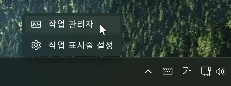 작업표시줄에서 마우스 우측버튼을 클릭하시면 아래와 같이 '작업관리자'를 선택할 수 있습니다.