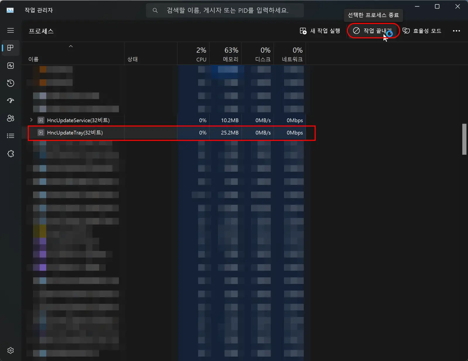 - 리스트에서 'HncUpdateTray.exe'를 찾습니다.