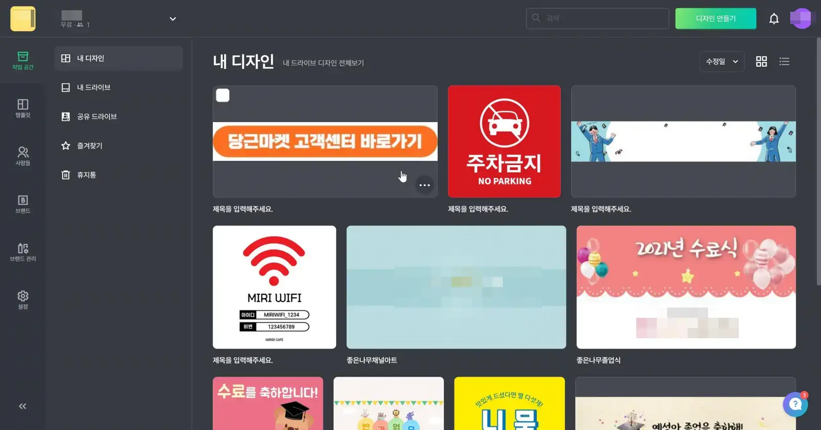 한번 디자인한 내용은 미리캔버스의 워크스페이스 '내 디자인'에 남아 있으므로 다음에는 글자만 수정하여 계속 사용할 수 있습니다. 포토샵이나 유로 프로그램 없이 간단하게 온라인으로 다양한 디자인을 할 수 있습니다.