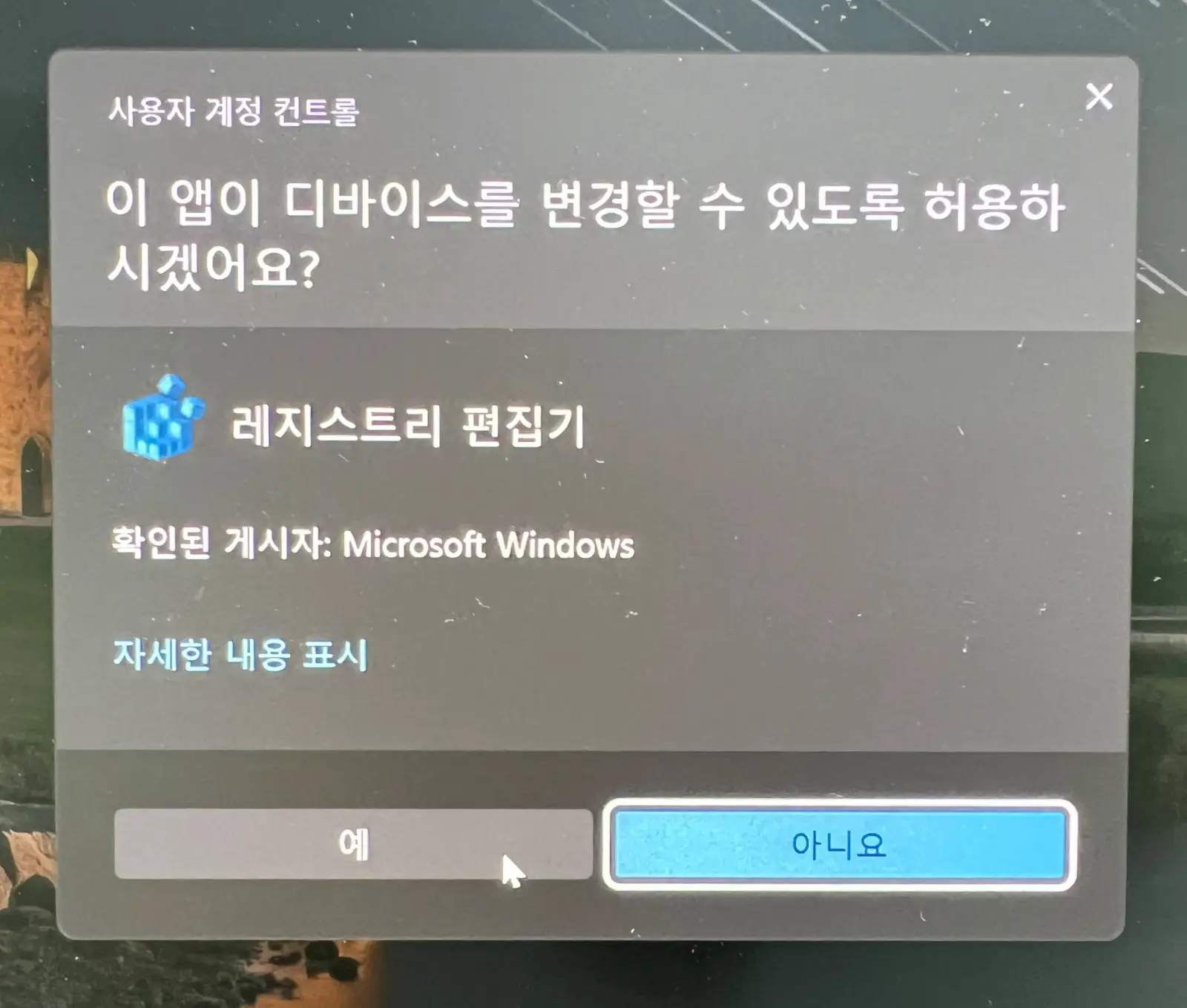 위와 같이 레지스트리 편집기 실행전에 경고 화면이 뜨는데 '예'버튼을 눌러서 진행합니다.