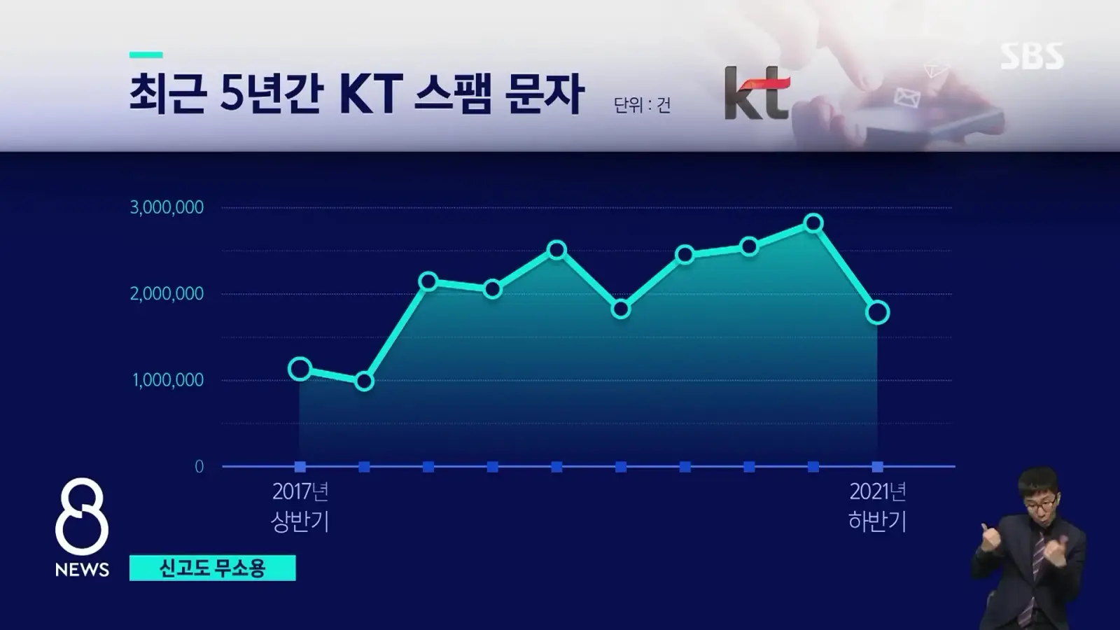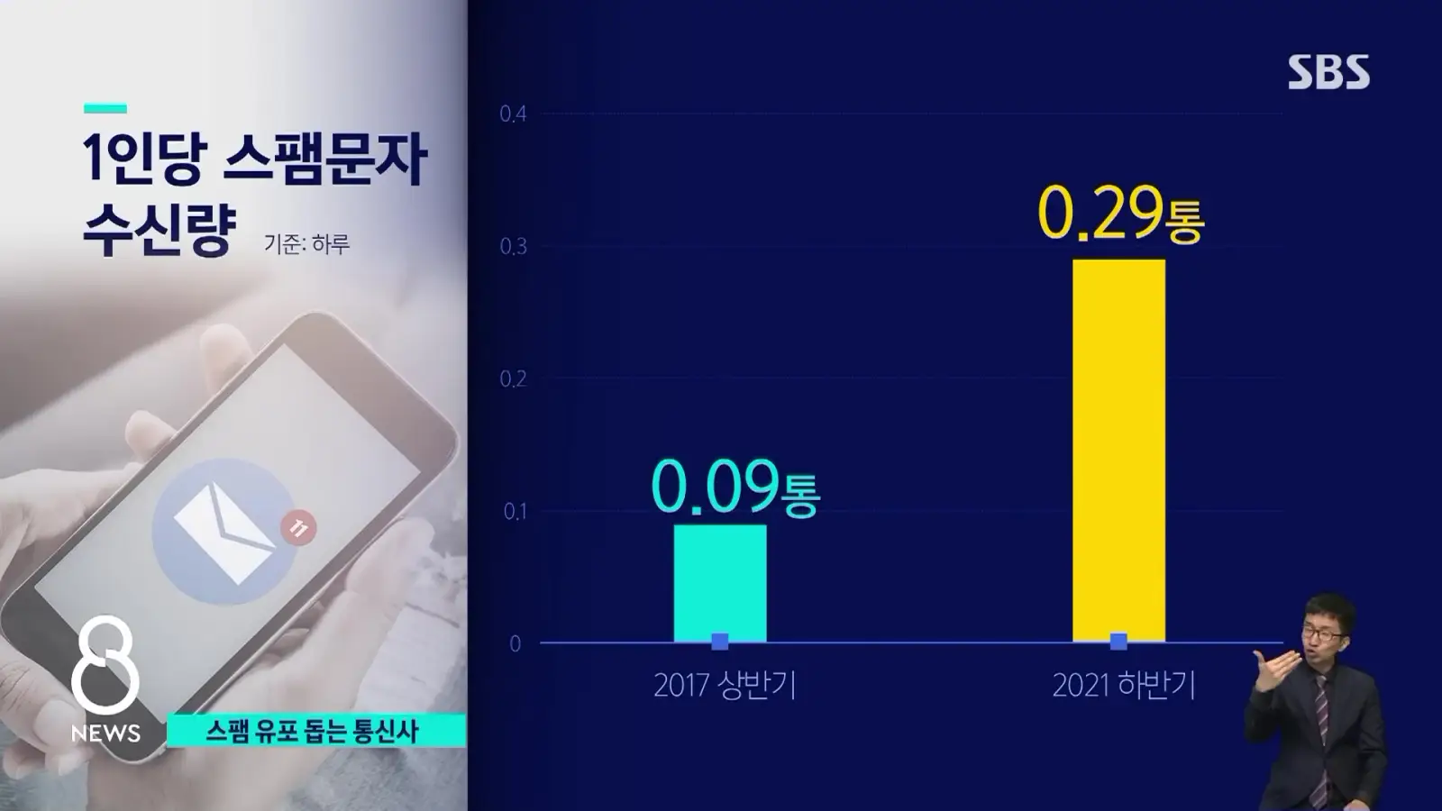 1인당 스팸문자 수신량은 해가 갈수록 늘어나서 2021년 하반기에 0.29통으로 조사되었습니다.