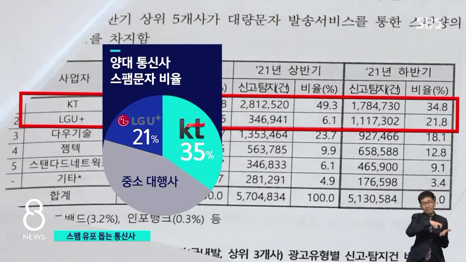 KT와 LG U+ 의 스팸문자 발송 비율은 전체 스팸문자의 56%에 달하고 있습니다.