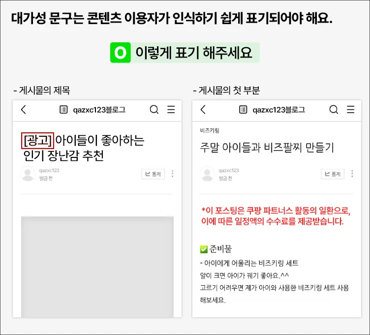 제목 앞 부분에 '[광고]'라고 표기하거나 내용을 첫줄 부분에 본문과 구분되는 글자 색상으로 "이 포스팅은 쿠팡 파트너스 활동의 일환으로, 이에 따른 일정액의 수수료를 제공받습니다." 라는 표기를 해야 합니다.