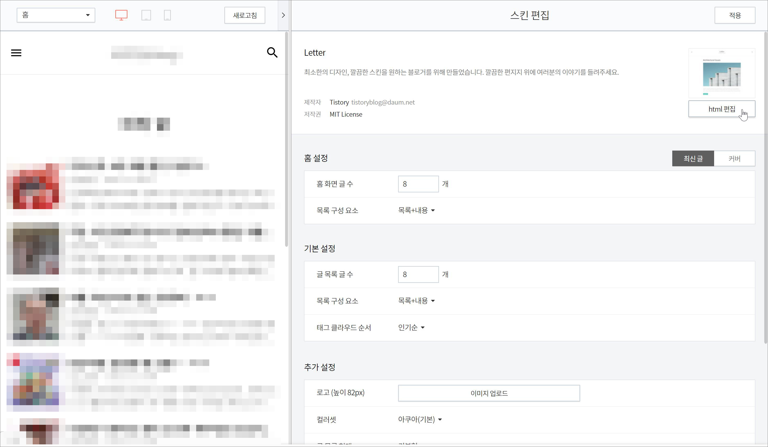 티스토리 관리자 화면에서 스킨 수정을 통해 html 코드 수정이 가능합니다.