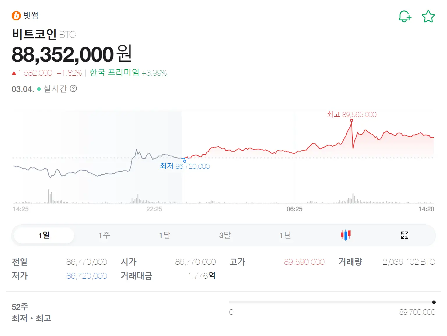 2023년 12월 초에는 1비트코인당 약 8천만 원이었던 시세가 2024년 3월 4일 현재 약 8천8백만 원으로 올라갔습니다.