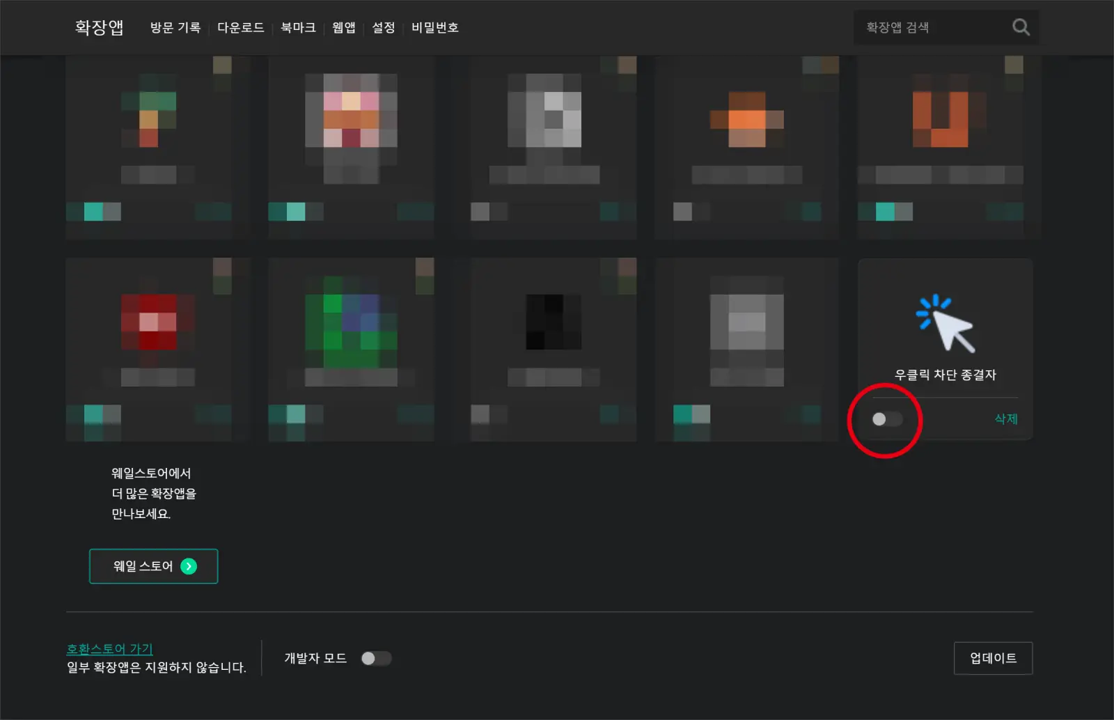 2. 우클릭 차단 종결자 확장 프로그램을 찾아 비활성화 또는 삭제