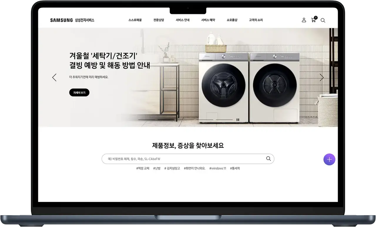 삼성전자 서비스 홈페이지의 '서비스 예약' 메뉴의 '출장서비스 예약' 서비스를 이용하면 상담원 연결 없이 홈페이지에서 출장서비스를 예약할 수 있습니다.