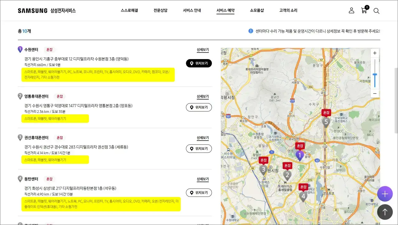 위와 같이 각 센터별로 서비스받을 수 있는 제품이 다르니 마찬가지로 방문 전에 확인을 하는 것이 좋습니다.