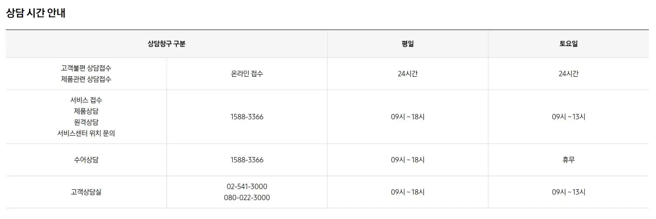 가벼운 제품들은 서비스 센터에 들고 가서 수리를 받을 수 있는데, 홈페이지의 '서비스 예약' 메뉴에서 가까운 서비스 센터를 찾을 수 있습니다. 보통 운영 시간은 평일 09:00 ~ 19:00, 토요일 09:00 ~ 13:00로 정해졌는데, 각 센터별로 운영시간이 다른 경우도 있으니 미리 확인하는 것이 좋습니다.