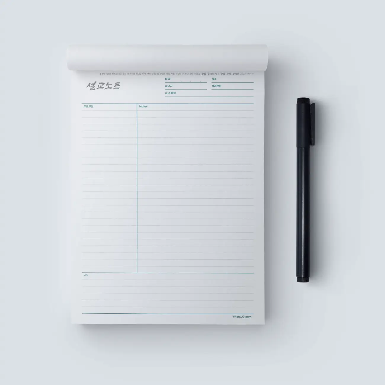 시중에는 구입하여 사용할 수 있는 설교노트 제품들이 많이 있는데, 개인의 취향에 맞춘 설교노트 양식을 구하는 것은 쉽지 않습니다.